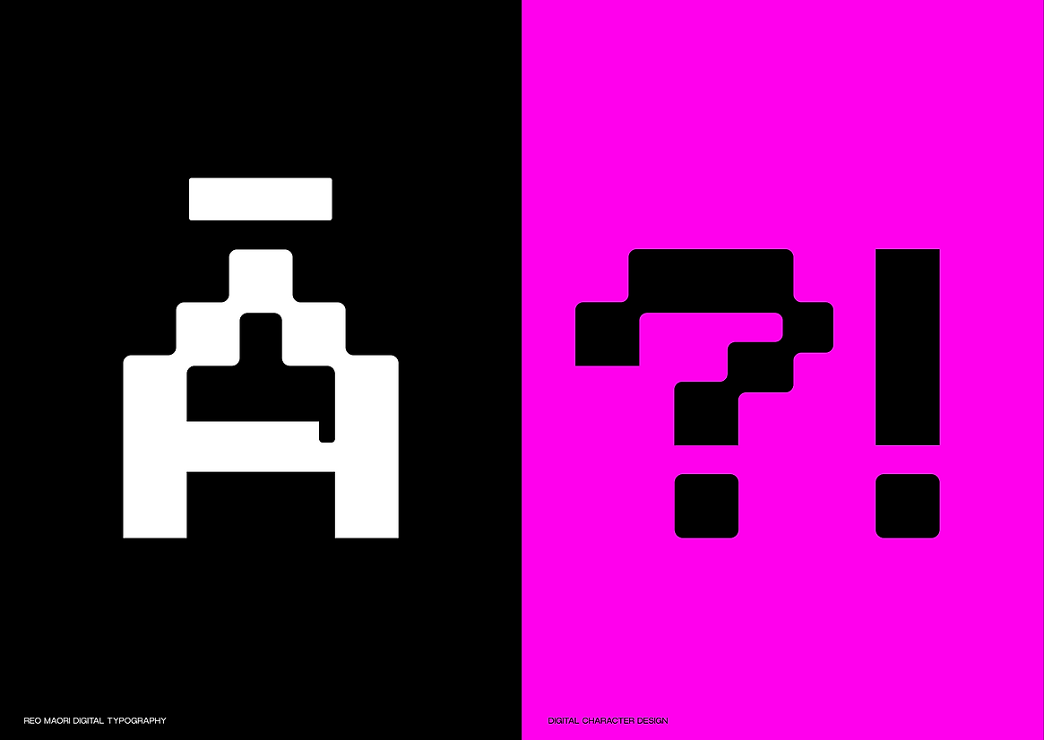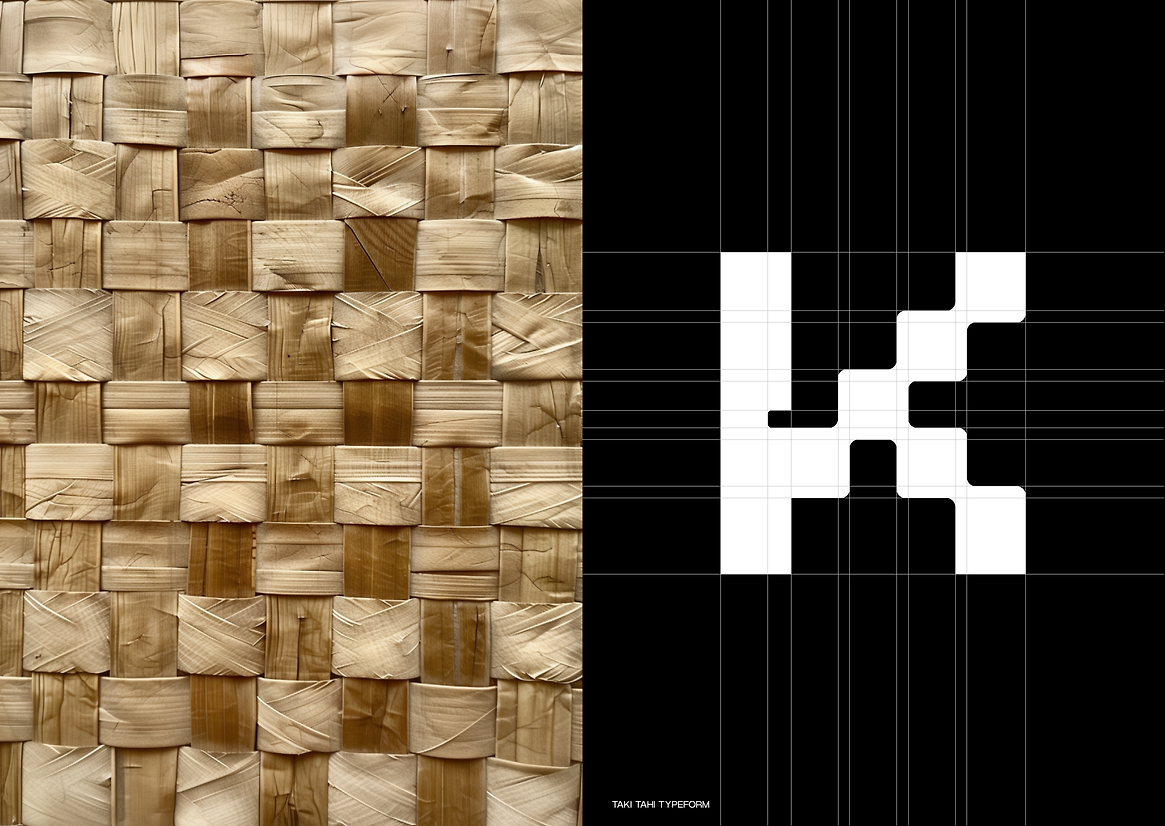 This inspired us to look within Taki Tahi weaving methodologies. The simple grid found in takitahi informed our digital woven patterns, which we used to devise a unique type face in both Te Reo Māori and English.