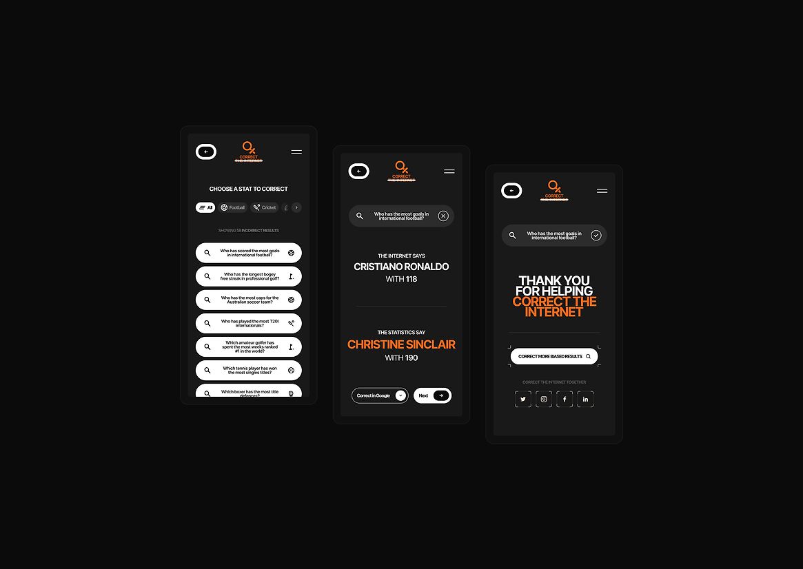 So we built the ‘Correct The Internet’ web tool. A website that serves you with a list of over 50 incorrect, biased search results collected from around the internet, and clear instructions on how to report them with just a couple of clicks – making it easier than ever for users to find and report these inaccuracies in the search engines, on a scale the search engines couldn’t ignore.