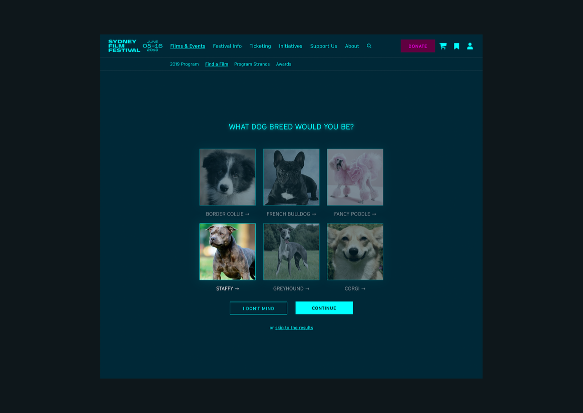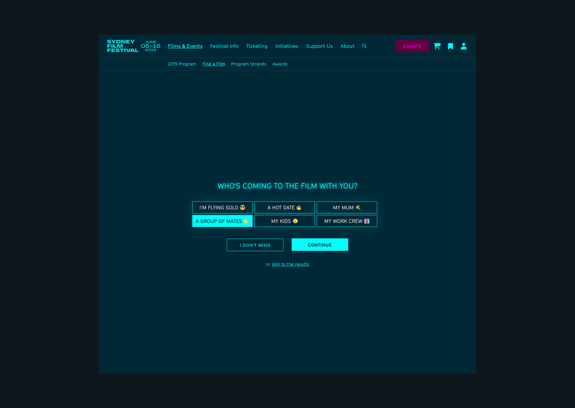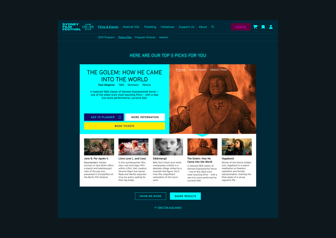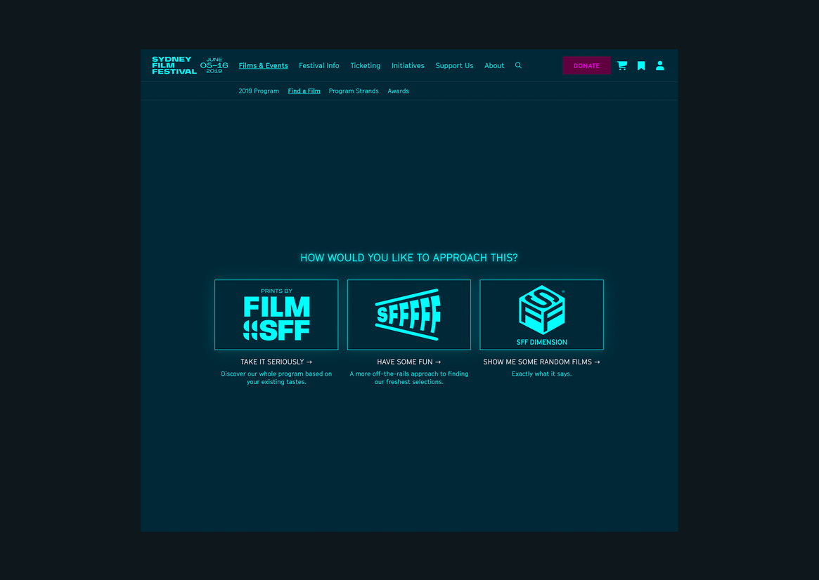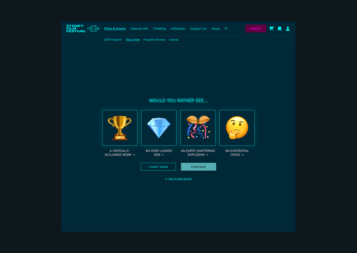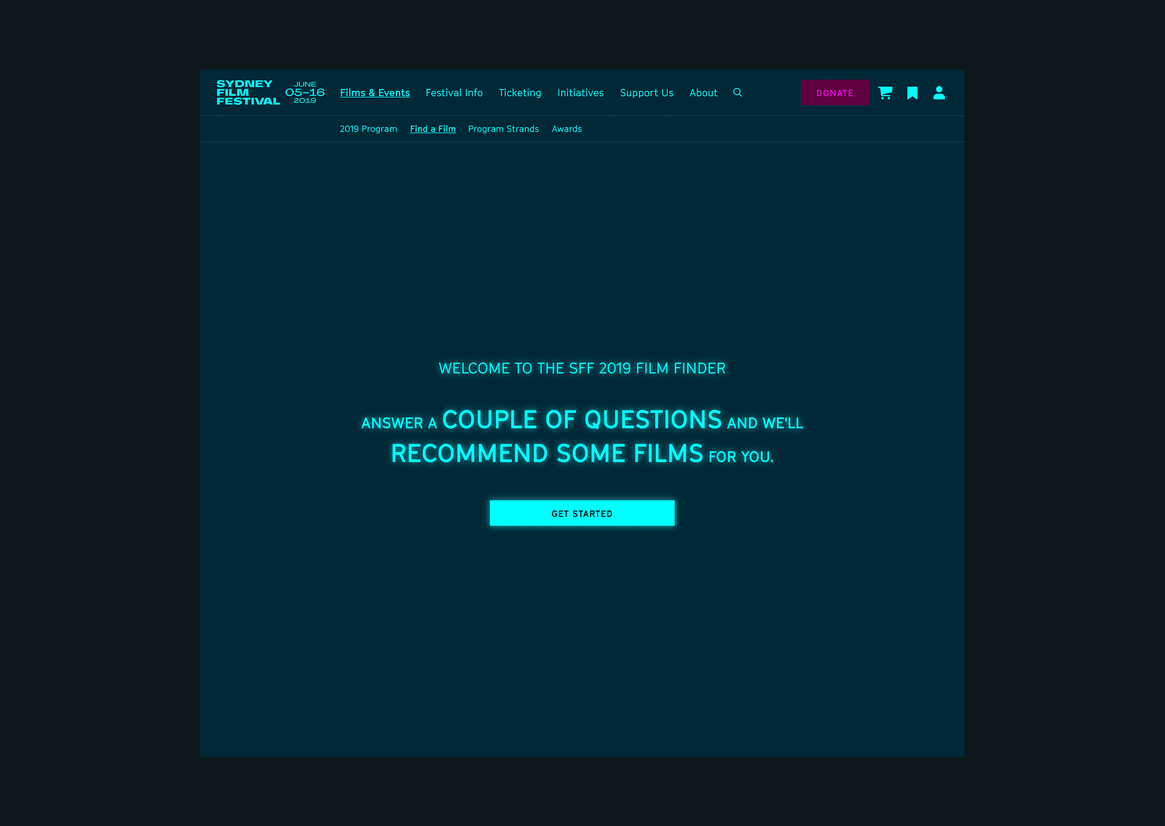 Digital Digital Campaigns Digital Products E-Commerce Websites (new 2024) Game Design Installation & Exhibition Large Scale Websites Small Scale Websites Student Digital User Experience (archived 2022) Animation Digital — formerly Interactive (2010–2019) Film Graphic Moving Image (archived 2025) Product Social Good Award Spatial Toitanga Value of Design Award User Experience Award (archived 2019) All categories Digital Campaigns Digital Products E-Commerce Websites (new 2024) Game Design Installation & Exhibition Large Scale Websites Small Scale Websites Student Digital User Experience (archived 2022) All years 2025 2024 2023 2022 2021 2020 2019 2018 2017 2016 2015 2014 2013 2012 2011 2010 Studio A-Z ED. 20 SFF 2019 Film Finder Finalist 2019 Digital Campaigns Credits Ringatoi Matua / Design Director Elliot Schultz Ngā Kaimahi / Team Member Daniel Lever Client Sydney Film Festival