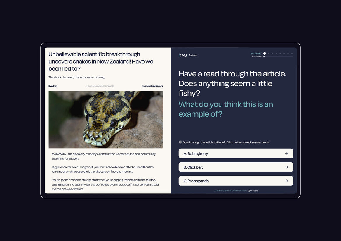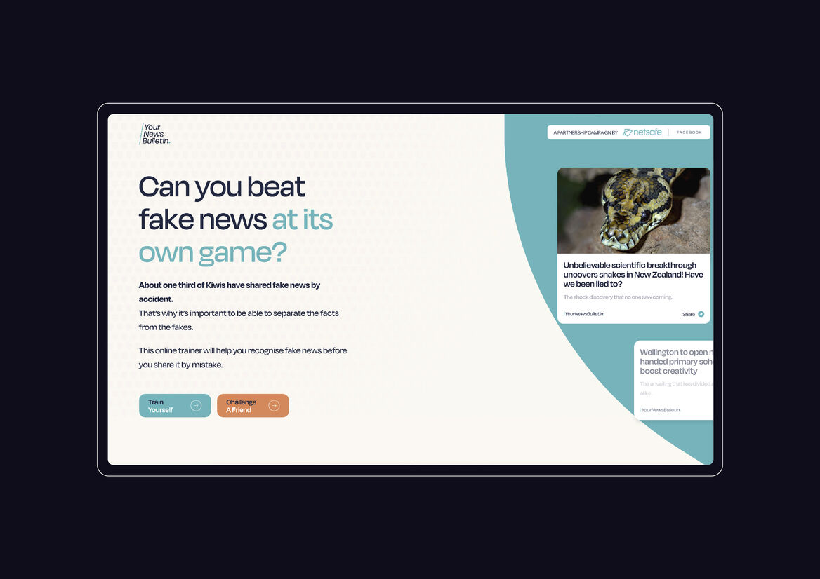 Digital Digital Campaigns Digital Products E-Commerce Websites (new 2024) Game Design Installation & Exhibition Large Scale Websites Small Scale Websites Student Digital User Experience (archived 2022) Animation Digital — formerly Interactive (2010–2019) Film Graphic Moving Image (archived 2025) Product Social Good Award Spatial Toitanga Value of Design Award User Experience Award (archived 2019) All categories Digital Campaigns Digital Products E-Commerce Websites (new 2024) Game Design Installation & Exhibition Large Scale Websites Small Scale Websites Student Digital User Experience (archived 2022) All years 2025 2024 2023 2022 2021 2020 2019 2018 2017 2016 2015 2014 2013 2012 2011 2010 Studio A-Z Motion Sickness 55 ED. 20 Your News Bulletin Finalist 2021 Digital Campaigns Credits Pou Auaha / Creative Director Sam Stuchbury Ngā Kaimahi / Team Members Alex McManus, Jordan Stent, Anna Maxwell, Will Macdonald Client Netsafe