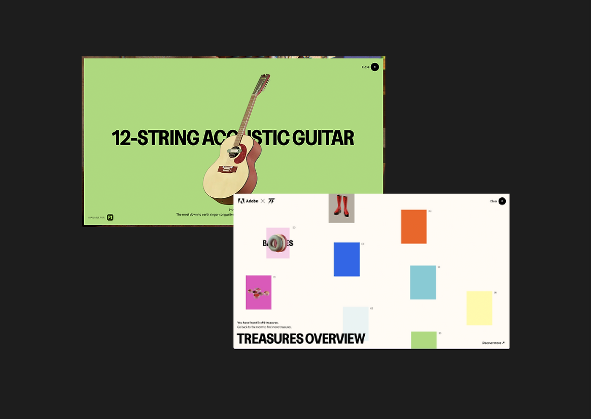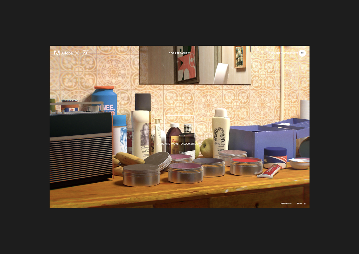 The gameplay involves you sneaking into the dressing room to find nine objects of significance. Each of the hidden objects can be downloaded as assets into the Adobe environment. Partway through the treasure hunt, we introduce a time limit to put you under pressure and push you to find the remaining treasures before he returns.