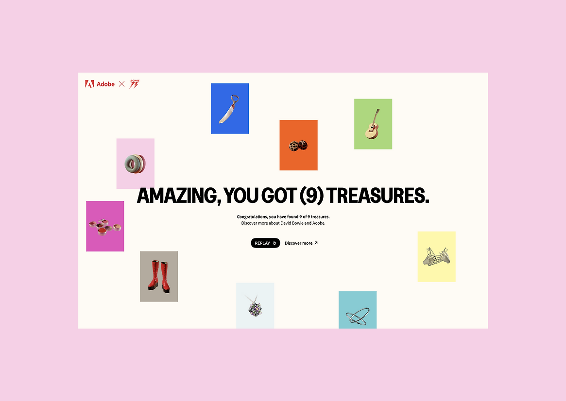 The end result was an immersive experience that transported users back in time to David Bowie’s dressing room circa 1972. With the Adobe x Bowie toolkit making headlines in online publications around the globe and organic traffic driven by social media, thousands of users flocked to the site. Our players couldn’t get enough of the dressing room atmosphere with the average user replaying the game 6.52 times, proving it was truly an experience worthy of a Starman.