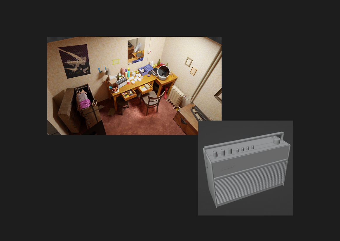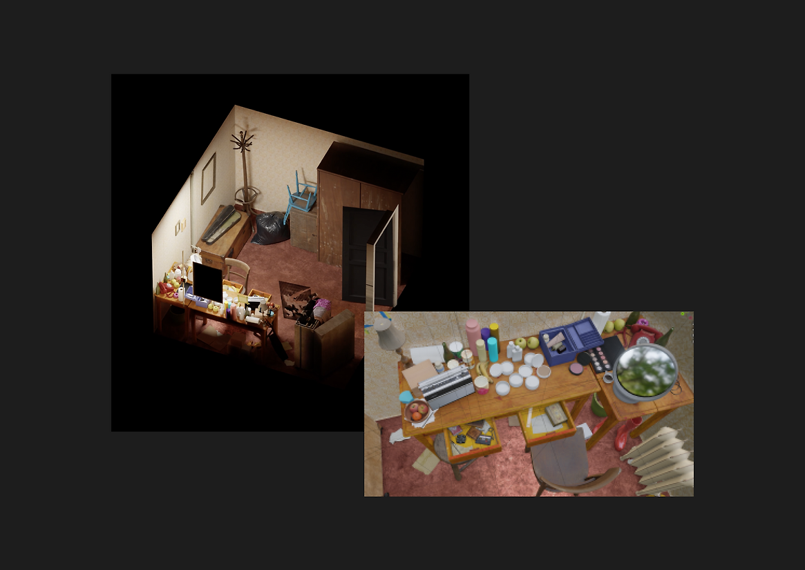 To make it feel like you’re moving around inside the photo we used a combination of 3D-modeled assets and 2D images projected onto a simplified mesh. By using this hybrid approach and adjusting the lighting, textures, atmospheric effects and depth of field, we were able to achieve a photographic aesthetic while still allowing you freedom of movement inside the room.