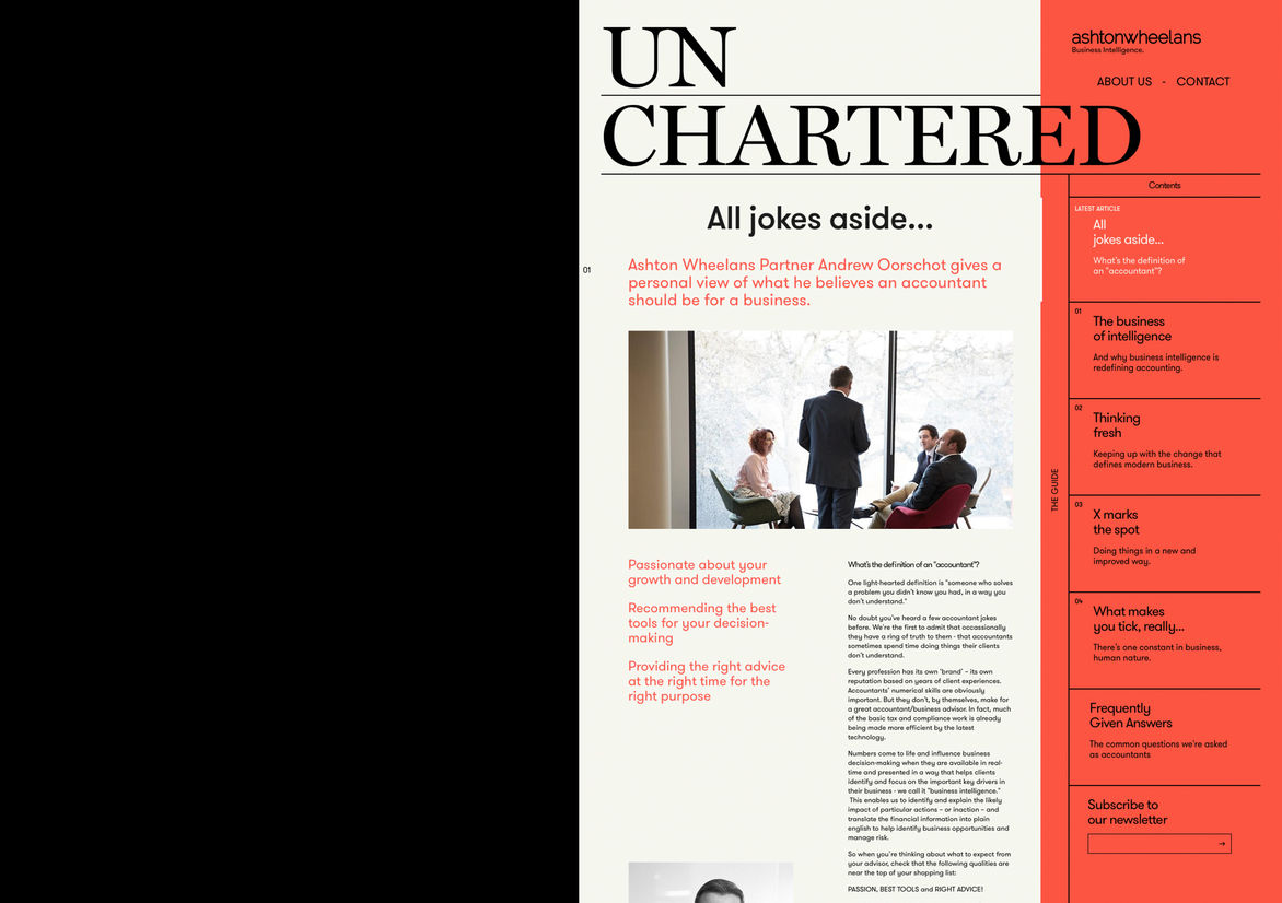 Digital Digital Campaigns Digital Products E-Commerce Websites (new 2024) Game Design Installation & Exhibition Large Scale Websites Small Scale Websites Student Digital User Experience (archived 2022) Animation Digital — formerly Interactive (2010–2019) Film Graphic Moving Image (archived 2025) Product Social Good Award Spatial Toitanga Value of Design Award User Experience Award (archived 2019) All categories Digital Campaigns Digital Products E-Commerce Websites (new 2024) Game Design Installation & Exhibition Large Scale Websites Small Scale Websites Student Digital User Experience (archived 2022) All years 2025 2024 2023 2022 2021 2020 2019 2018 2017 2016 2015 2014 2013 2012 2011 2010 Studio A-Z Sons & Co. 137 Unchartered Finalist 2016 Digital Campaigns Credits Pou Auaha / Creative Director Timothy Kelleher Ngā Kaimahi / Team Members Matthew Arnold, Brendon Muschamp, Andy Allison Kaitautoko / Contributor Lightworkx Client Ashton Wheelans