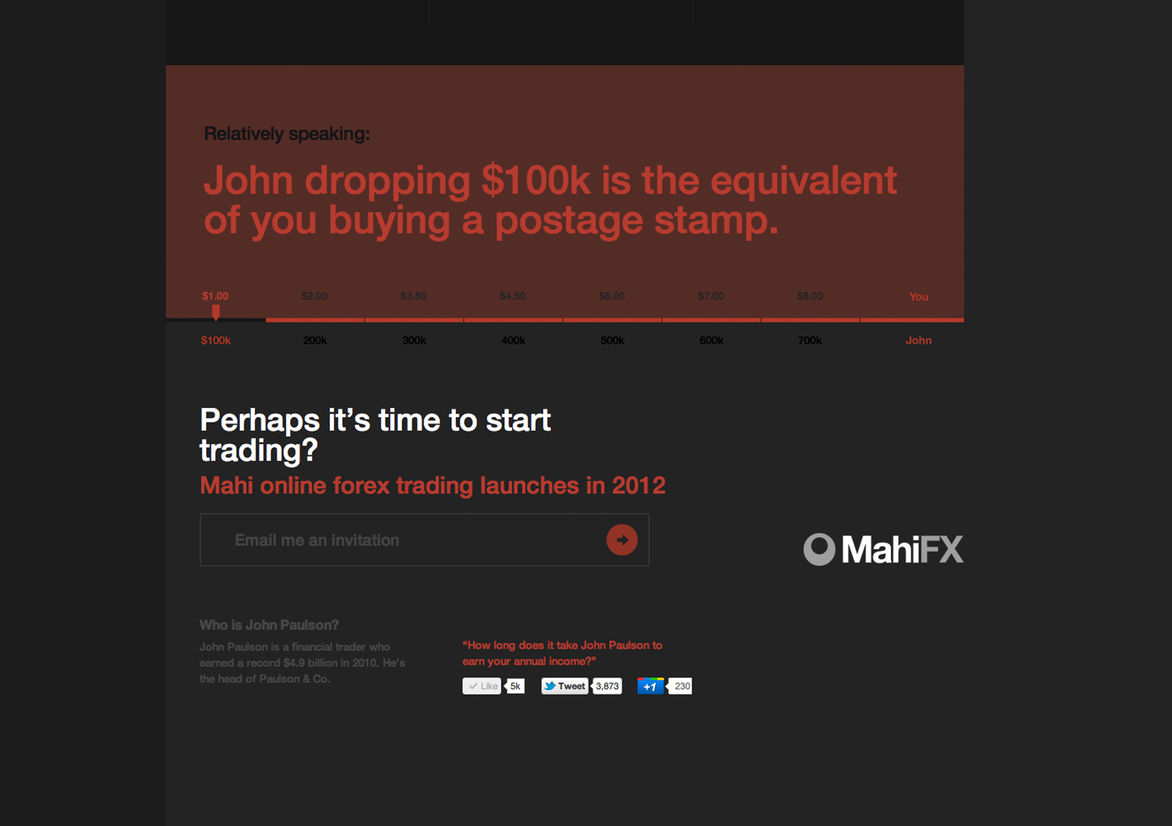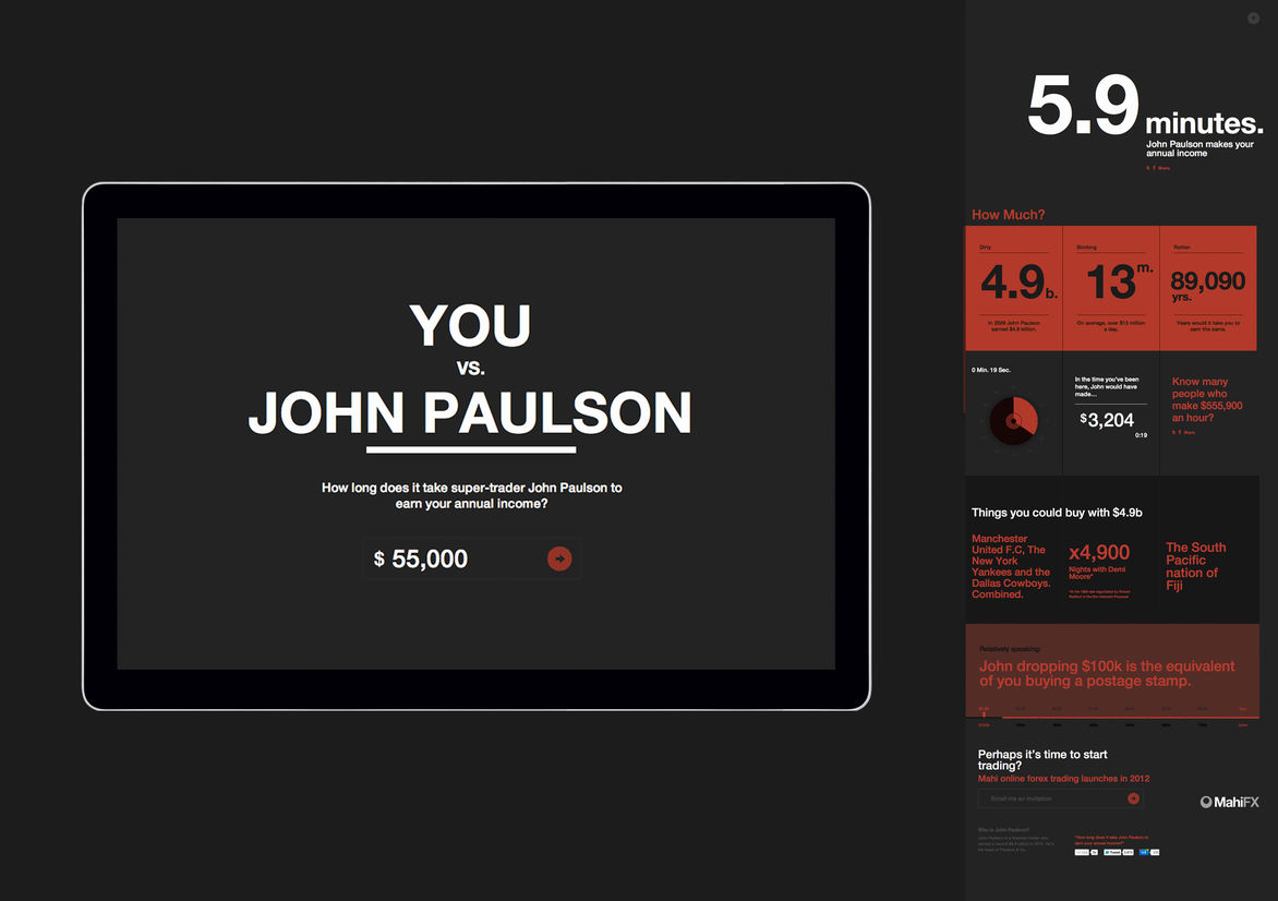 Digital Digital Campaigns Digital Products E-Commerce Websites (new 2024) Game Design Installation & Exhibition Large Scale Websites Small Scale Websites Student Digital User Experience (archived 2022) Animation Digital — formerly Interactive (2010–2019) Film Graphic Moving Image (archived 2025) Product Social Good Award Spatial Toitanga Value of Design Award User Experience Award (archived 2019) All categories Digital Campaigns Digital Products E-Commerce Websites (new 2024) Game Design Installation & Exhibition Large Scale Websites Small Scale Websites Student Digital User Experience (archived 2022) All years 2025 2024 2023 2022 2021 2020 2019 2018 2017 2016 2015 2014 2013 2012 2011 2010 Studio A-Z Sons & Co. 137 You vs John Paulson 2012 Digital Campaigns Credits Ringatoi Matua / Design Director Timothy Kelleher Ngā Kaimahi / Team Members Matthew Arnold, Andrew Brehaut Kaitautoko / Contributor Strategy Design and Advertising Client MahiFX