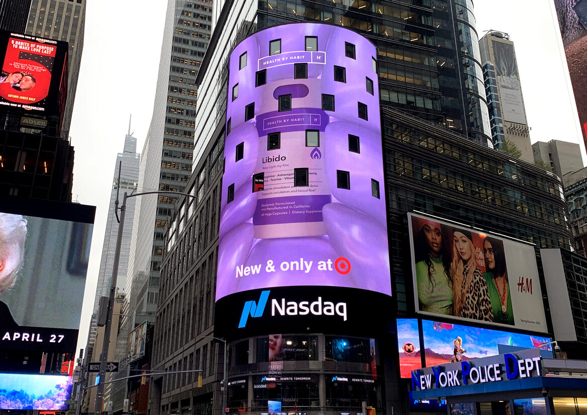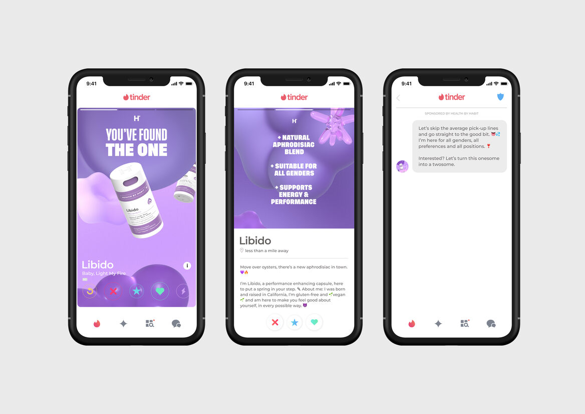 Our objective was to make Libido feel like a departure from the normal Health by Habit content. We created a suite of 3D graphic assets that would be used across our internal channels and external platforms, including a billboard centrally located in Times Square, New York; and a digital partnership with Tinder, in which we created a Branded Profile Card in app that would encourage users to discover Libido via profile photos and a cheeky bio, before asking them to ‘swipe right’ to drive through to purchase.