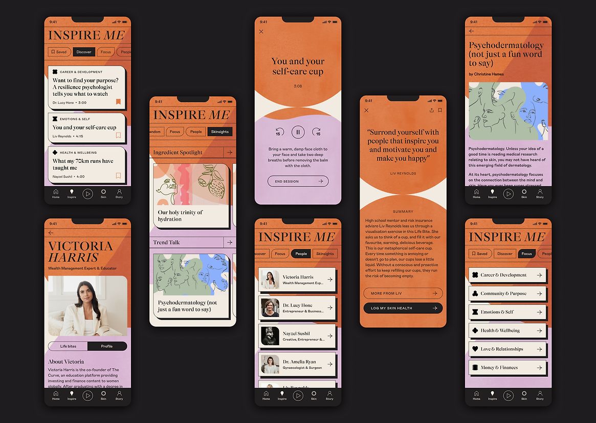 Users choose from a selection of ‘Life Bites’, which are curated from their answers to “My Story.” Life Bites are 2-4 minute pieces of audio (contributed by a diverse collective of inspiring people), designed to be listened to during skincare routines. They're a melting pot of personal, practical, hilarious, emotional advice and wisdom, and divided into six areas: health, emotions, relationships, career, money and community. Each Life Bite ends with a summary (which can be saved) and a quote (which can be shared to socials).
