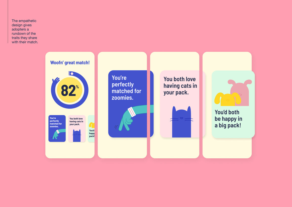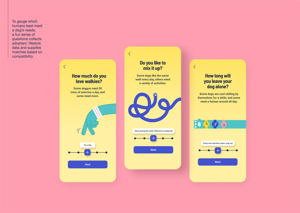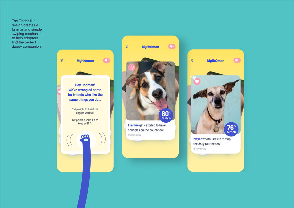 MyHooman’s dog-first tech matches dogs to the human that best suits their needs. A fun profile builder collects user life-style data and feeds it through an intelligent algorithm that matches dogs with compatible adopters. Much like the Tinder UI, users can flick through a stack of match cards showing the profile of various dogs with similar traits. This means dogs are more likely to get a perfect match the first time, and are less likely to be returned to a shelter.