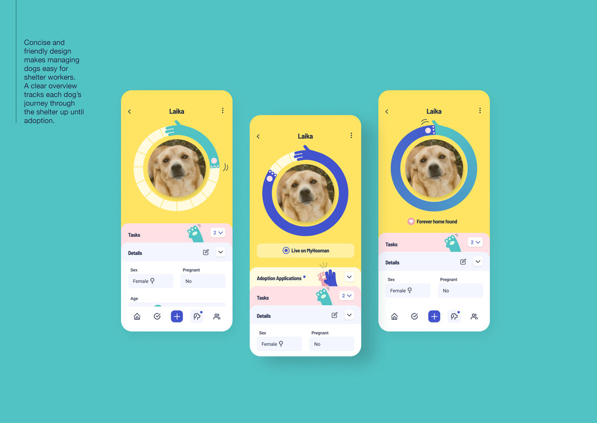 Our research showed that existing platforms were dull and non-experience led. Another problem was that shelter workers suffering from compassion-fatigue were disengaged, causing the priority of dogs’ wellbeing to slip. MyHooman is tailored to benefit shelters and potential-adopters alike.