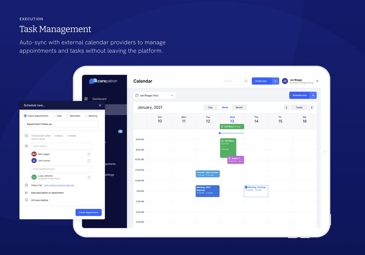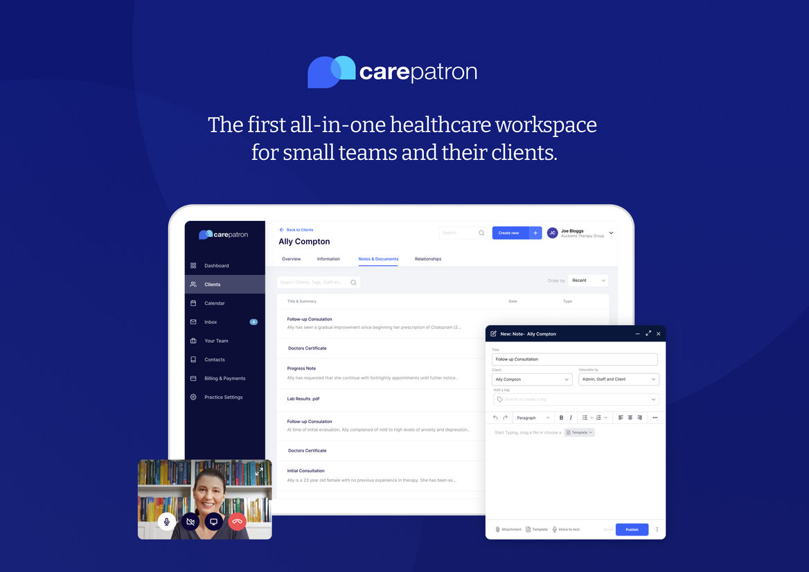 Carepatron is the first all-in-one healthcare workspace for small teams and their clients. For practitioners, it’s a sleek platform that consolidates daily workflow, communications, and payments. For clients, it’s a beautiful app that powers their healthcare experience with the ability to securely manage records, communication, appointments, and payments.