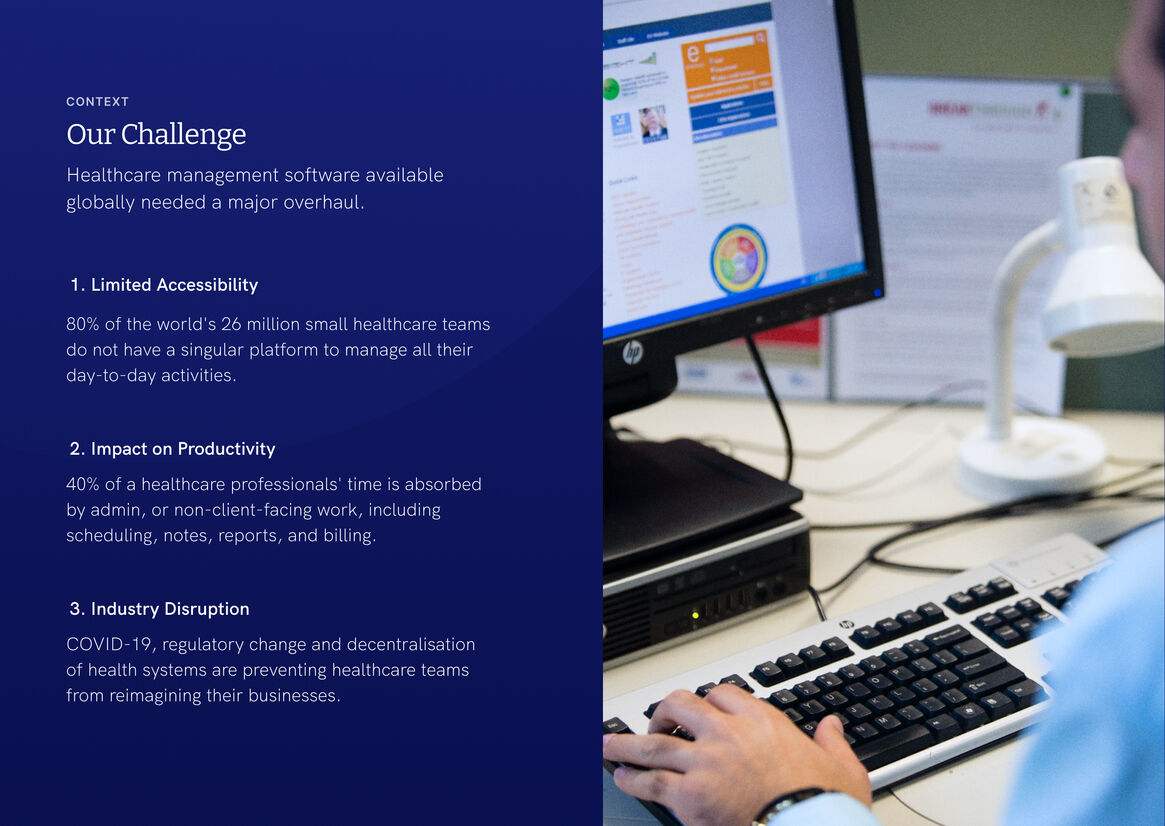80% of the world's 26 million small healthcare teams don't have a singular platform to manage their day-to-day activities. Instead, they 'hack' together single-feature products and manual processes. This heavily impedes their client interaction considering 40% of their day is consumed by scheduling, communication, notes, reports, billing, and payments.