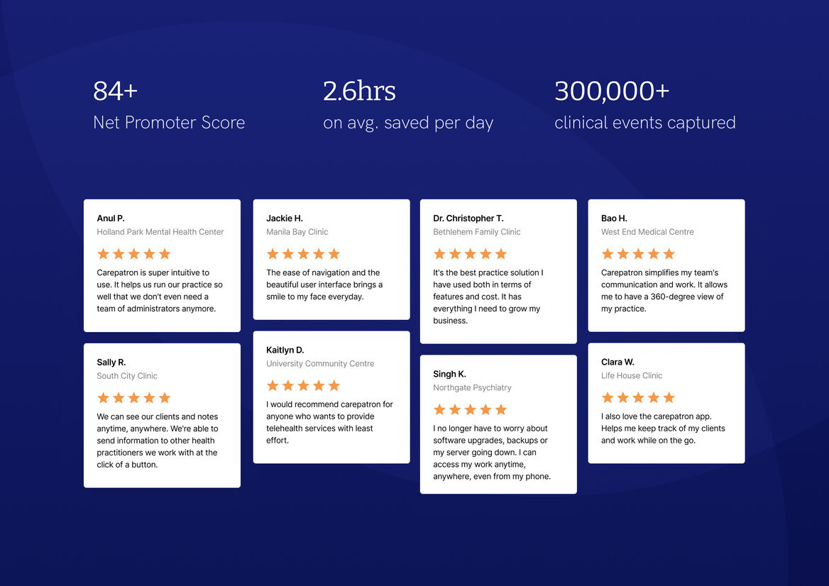 Carepatron was co-created with practitioners to ensure we met their basic needs, and built on them, to create a platform they would love to use. We ran behavioural interviews and questionnaires with 706 health professionals. Then, we tested an MVP solution with 234 healthcare teams across 9 countries, including NZ, Australia, Asia Pacific, and North America.