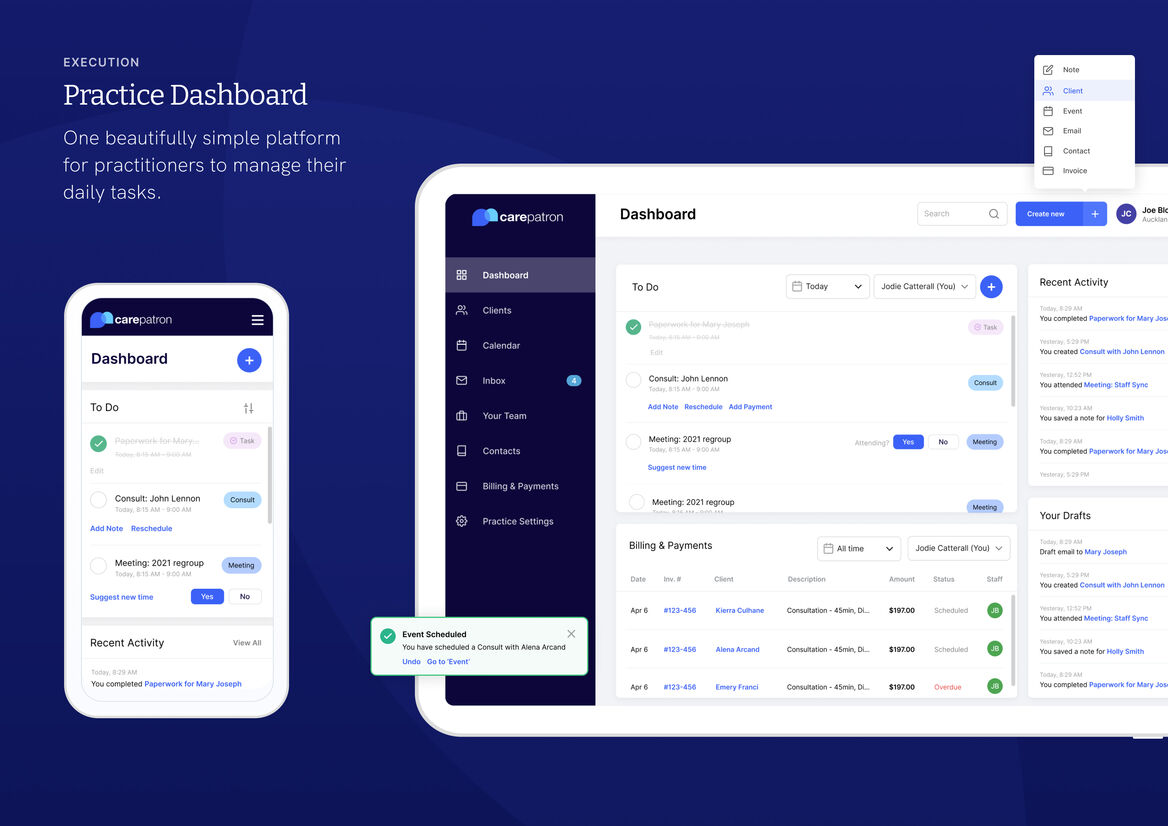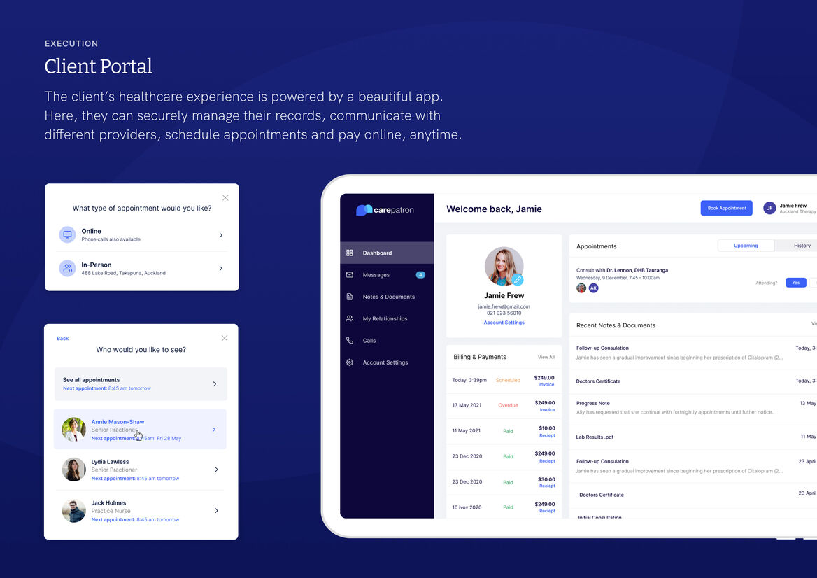 Early on, we discovered the lack of existing solutions meant practitioners were using outdated tech and processes. This meant Carepatron had to cater to all skill levels and be accessible across different devices with varying resolutions. Practitioners are also expected to step into new teams or support a crisis at short notice, therefore it was imperative our solution was fully utilizable without prior training.