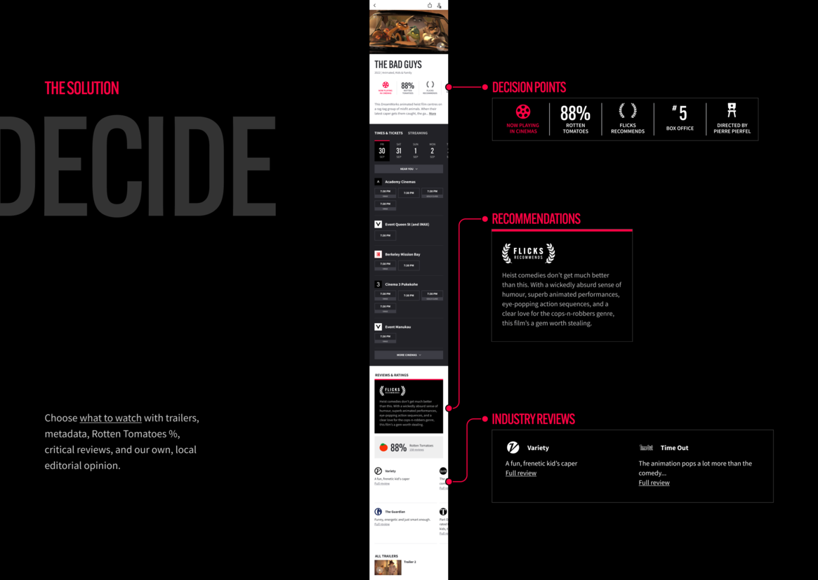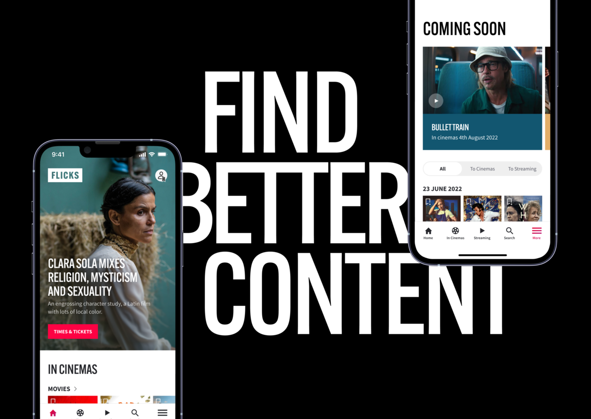The Flicks app is a cinema and streaming guide that connects users with better content. It brings together nationwide showtimes, streaming listings, and original editorial opinion – to help you find something good to watch and show you where to watch it. The app is available in the New Zealand, Australian and UK markets.