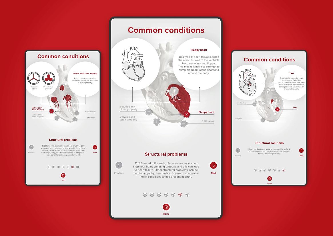 Given the complex content, the focus was on designing intuitive UX and UI that allowed users to control the direction and pace of their experience. An initial prototype was developed with the support of medical specialists ensuring the experience was medically correct. From there, the focus was on simplifying the visuals and language to make it more accessible for users. Navigation was kept simple, utilising universally understood symbols. A series of prototypes were developed and used for ongoing testing of content, design and UX elements, allowing the best finished product possible.