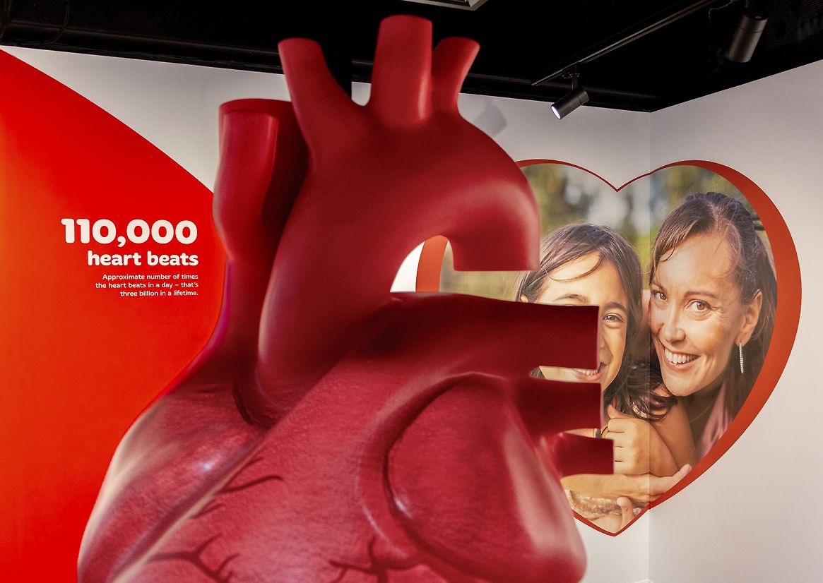 The giant heart sculpture, near the main entrance, is made of fibreglass and stands at over two-metres tall, compelling visitors to engage with it. 3D projection offer an accurate depiction of a beating heart, complete with pumping veins and arteries. The realistic feel is further enhanced by the addition of an rhythmic heartbeat when in proximity to the sculpture.