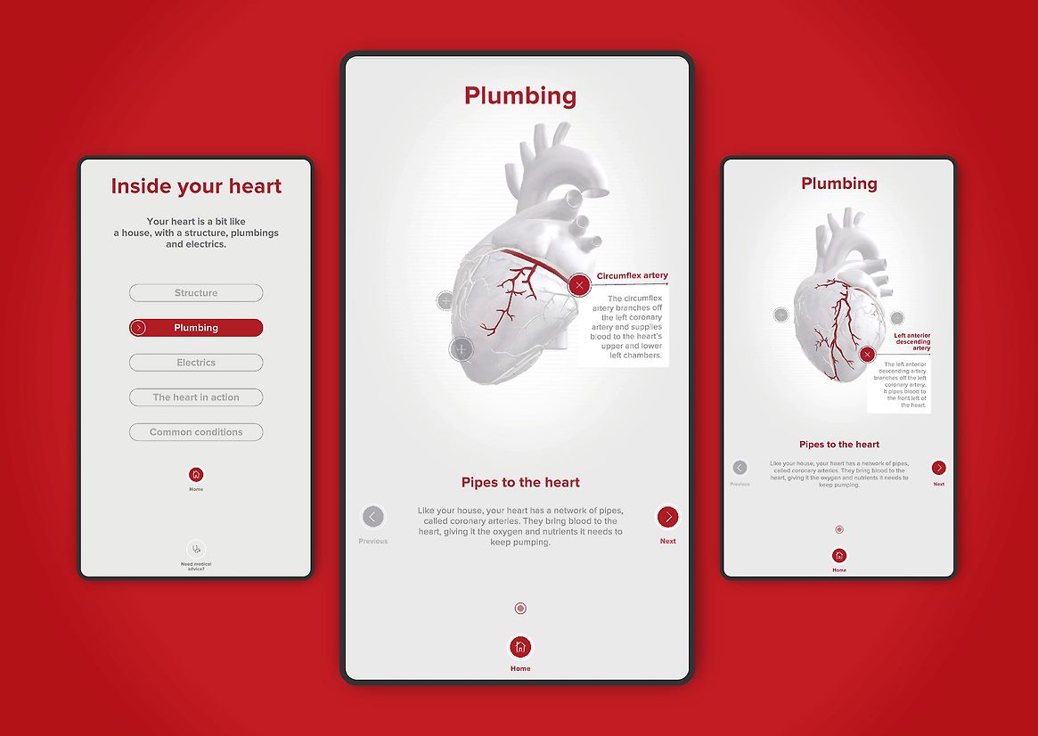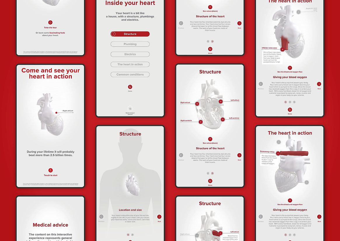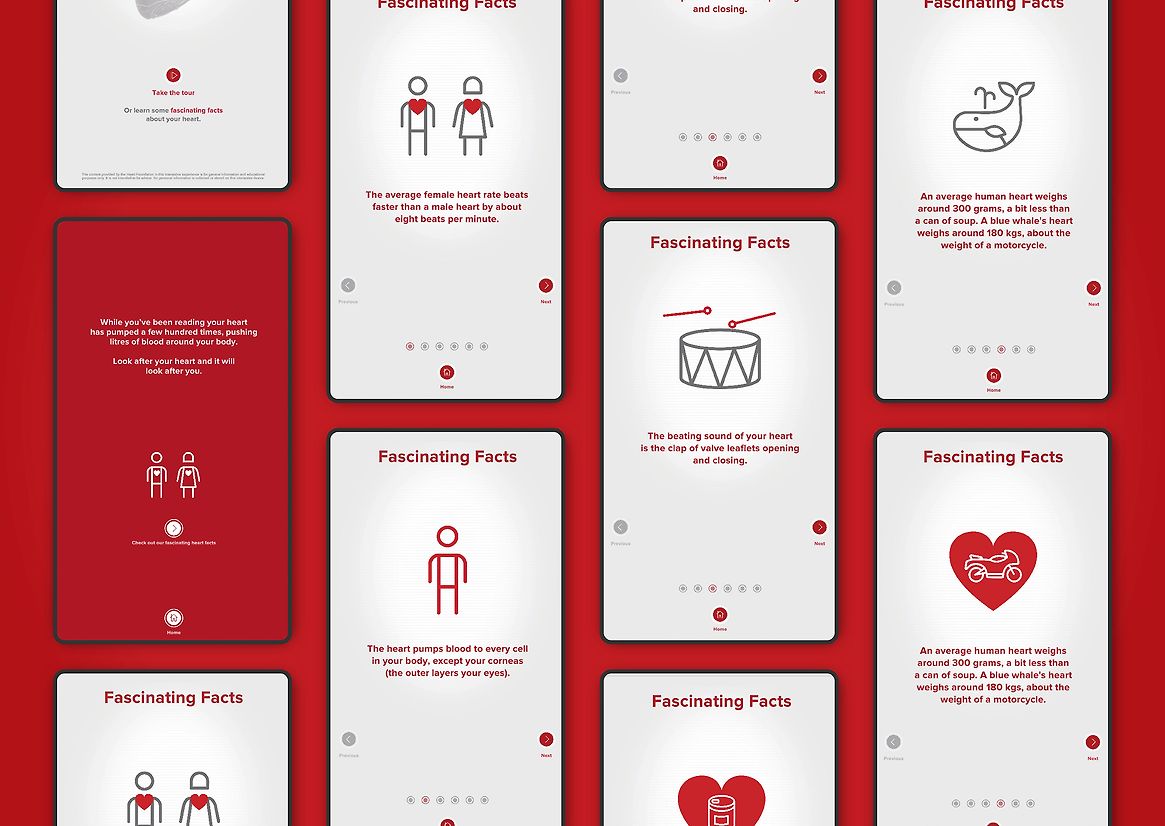 Behind the big heart is a large wall-mounted interactive screen that takes users deep into the mechanics of the heart. We adopted a simple ‘house’ storytelling analogy, complete with descriptions of the heart’s walls, electrics and plumbing, to make it easier for audiences to understand. Each section allows the user to simply click or swipe to explore how the heart works, common conditions and common treatments. The medical information is complemented by a less serious ‘fascinating facts’ section that offer real-world context to heavy medical facts.