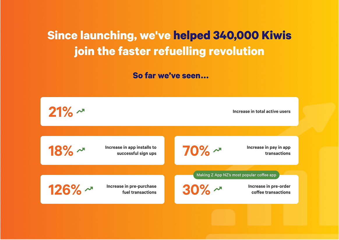 The revamped Z Energy app achieved remarkable success, demonstrating significant improvements in user engagement and business metrics: