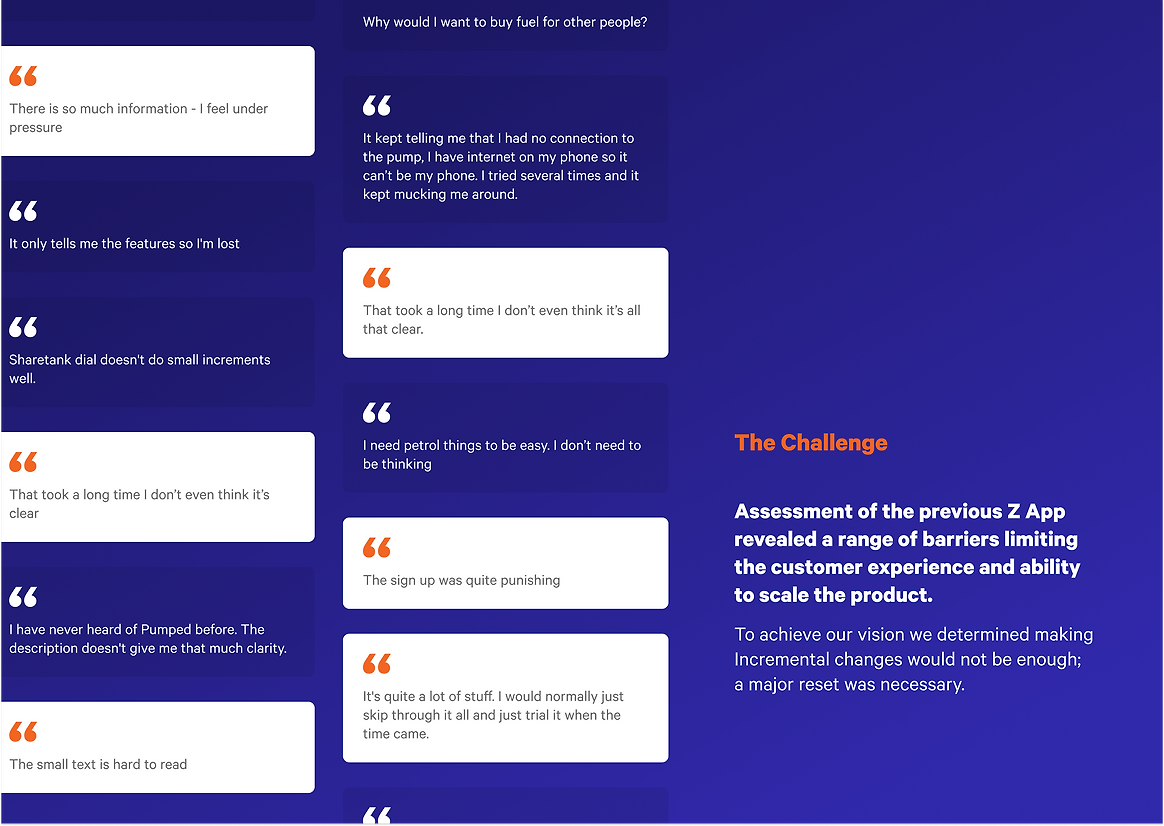 Z Energy, a leading New Zealand fuel retailer, faced challenges with their existing mobile app. Despite introducing innovative features like Fastlane, Sharetank, and Pre-order, the app struggled with user adoption and engagement. Comprehensive research revealed significant barriers to user experience, including cognitive overload, feature complexity, navigation issues, and technical problems. These challenges limited both customer satisfaction and Z Energy's ability to scale the product effectively.