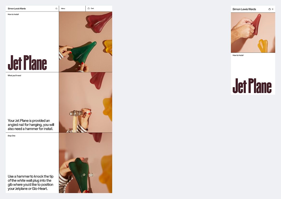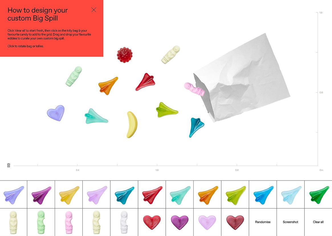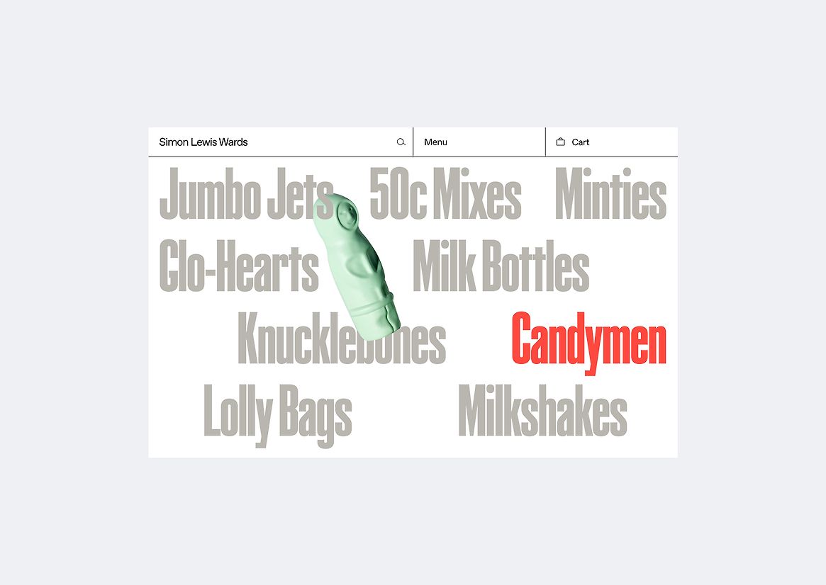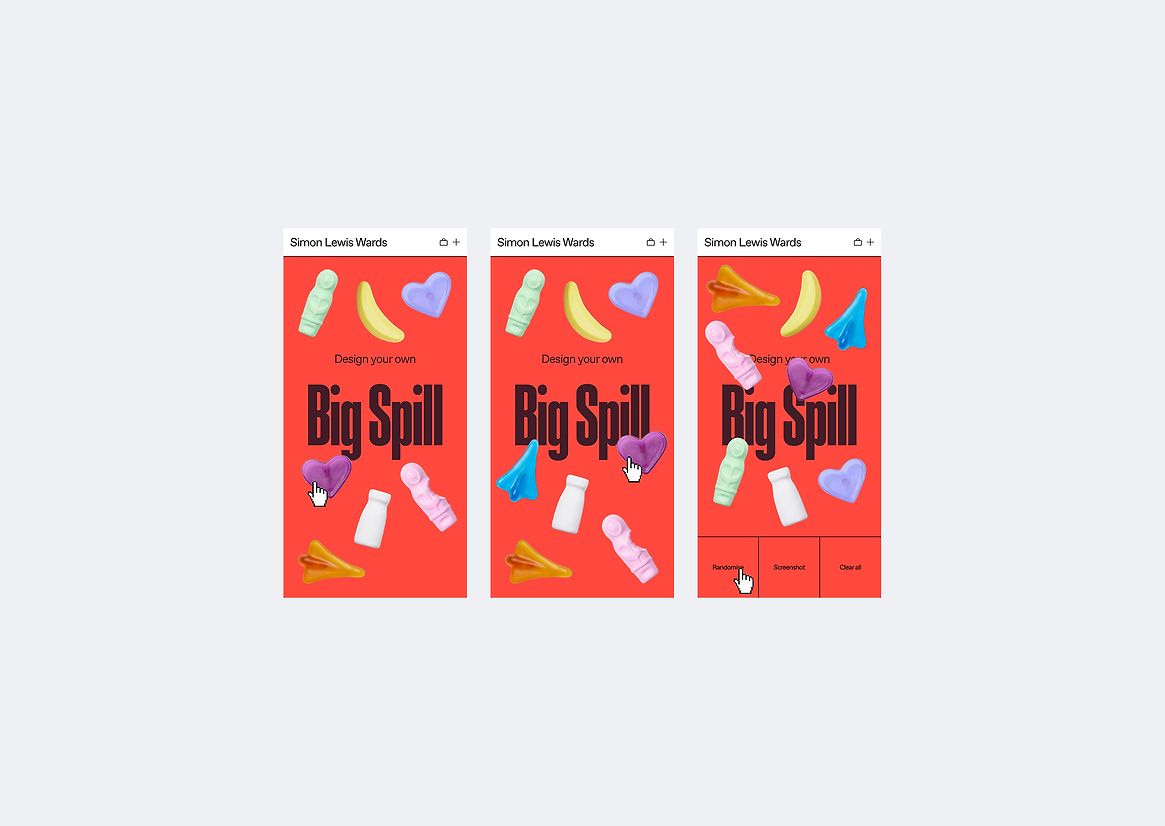 The brand tools and overall design for Simon Lewis Wards were refreshed during the undertaking of the new e-commerce store upgrade. Bold typefaces were chosen for greater impact. An abundance of colour and imagery was interjected to liven up the store for an immersive world of art for everyone. A grid-based layout system was used to divide the products and advertising imagery into zones, creating a clear user journey for a happy shopping experience. A bespoke ‘Big Spill’ feature was custom-coded into the site. Here you can select and arrange a collection of your favourite candy art into a bespoke wall arrangement as it spills from a ceramic bag. This is then captured upon purchase and installed in your home to your exact specifications.