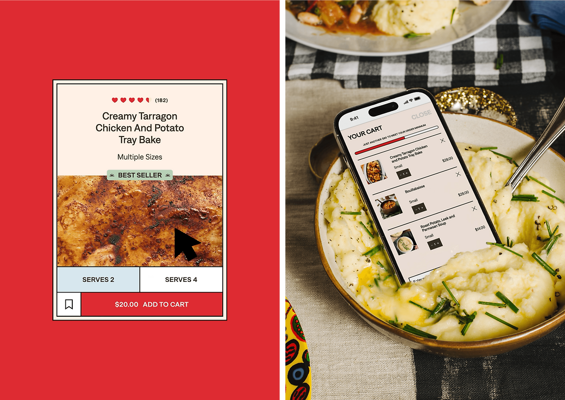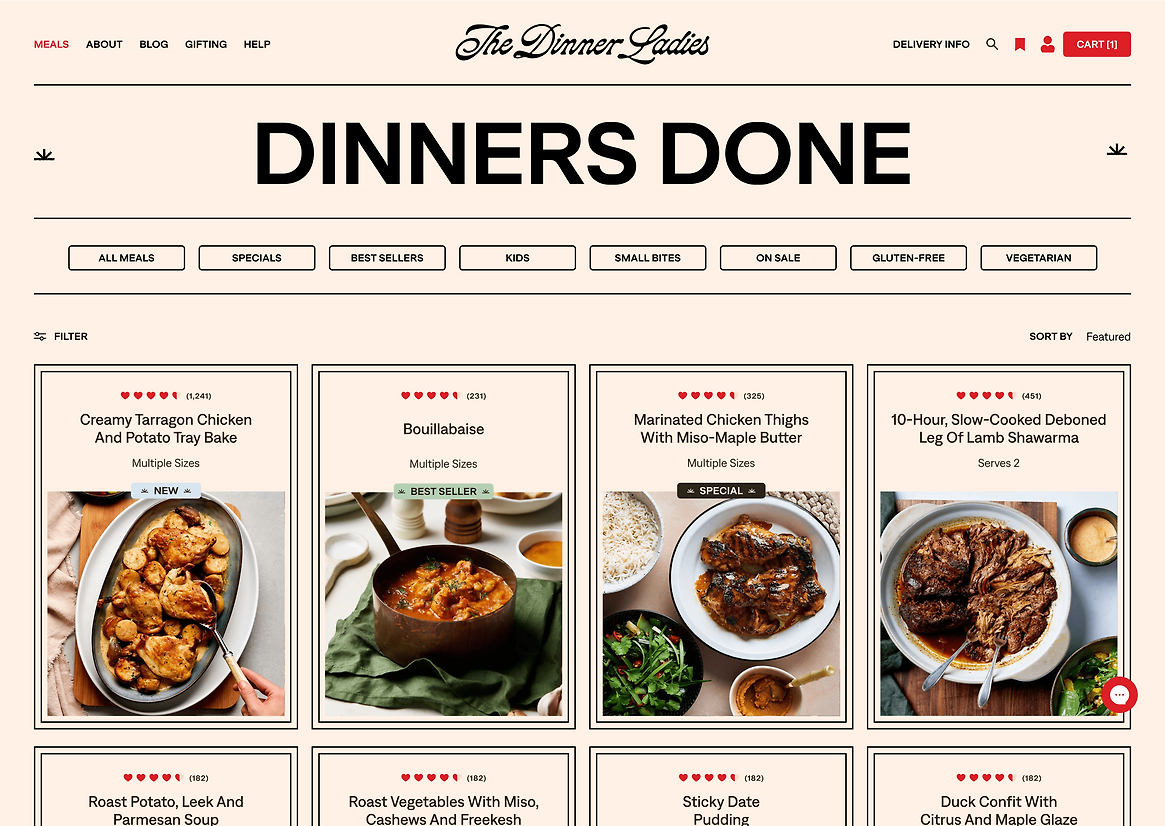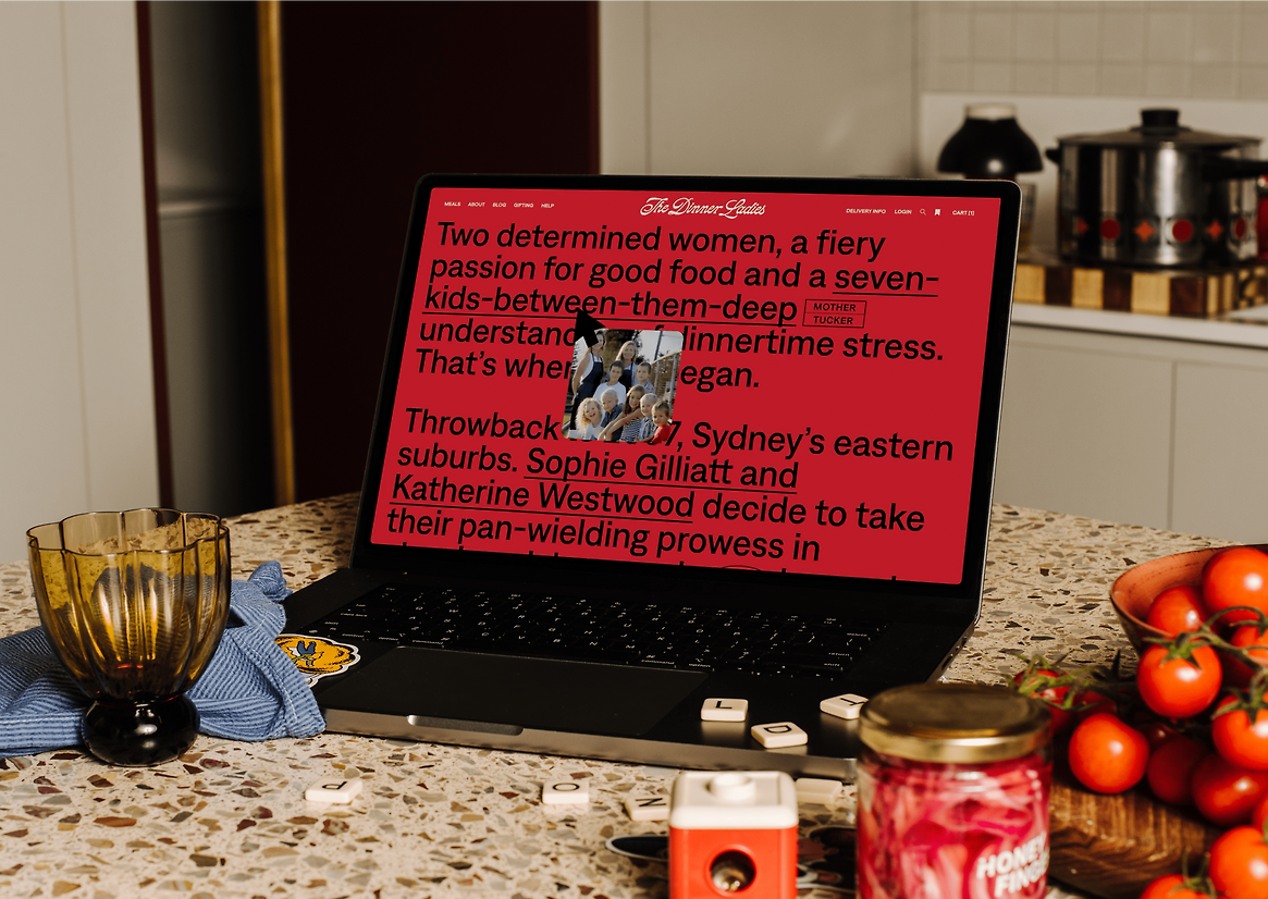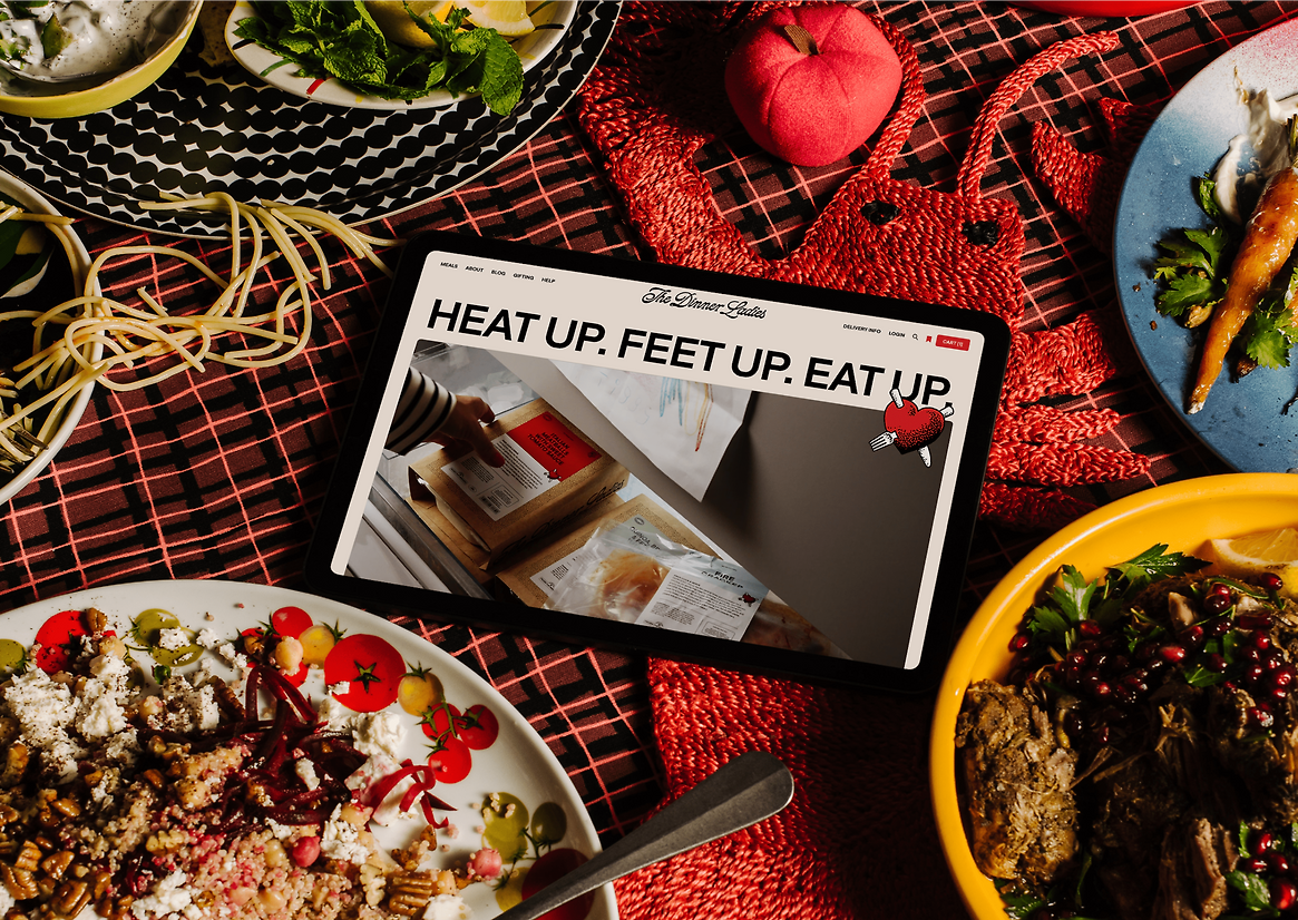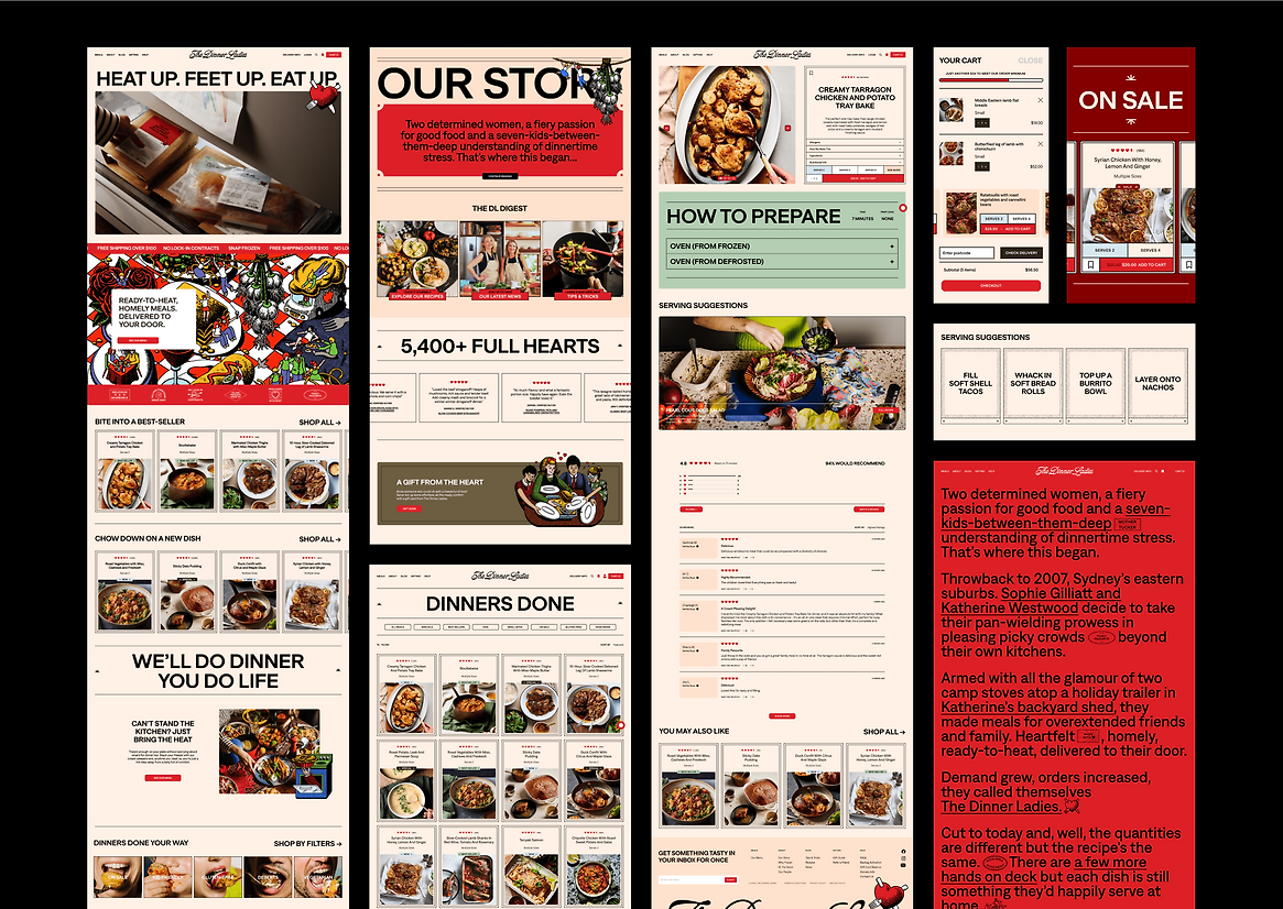 The redesign focused on the main website touchpoints, from wireframing through to design across the homepage, product pages, about us page and cart functionality. It included upgrades and introductions of new features such as quick filters and a bookmarking tool to help customers more easily navigate through the extensive menu, jump to their favourite meals or refine by dietary needs (because it’s already hard enough being gluten-free). The About Us page was also used as an opportunity to showcase The Dinner Ladies' unique and tenacious origin story that had inspired so much of the new look and feel.