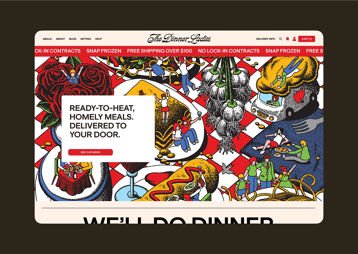 The Dinner Ladies are a Sydney-based frozen meal delivery service serving ‘freezer filler’ comfort meals. Over their 17 year history, the brand had become diluted and their punchy, counter-‟mumsy” attitude was lost to category cliches while filtering had become convoluted and hard to navigate. The redesign needed to embrace their rich history with a more contemporary look and feel while ensuring their time-poor audience could navigate efficiently.