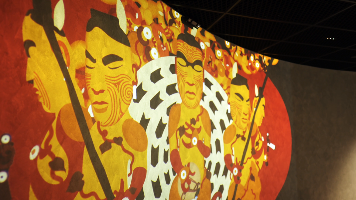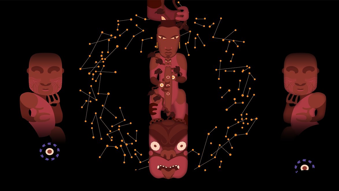 In the first section, Te Kore, manuhiri are greeted by atua and kaitiaki, who follow them through the scene with motion tracking. Placing the eyes of the central pou into his head unlocks the next space, Te Pō. In Te Pō manuhiri are meet by a large Pou in a composition mimicking a carved pare. These pare (lintel) carving mark unique places of transition, such as that into a wharenui. After moving elements into the right stage here, users finally arrive in Te Ao Tūroa. The world of long-standing light created by Tāne-nui-a-Rangi.