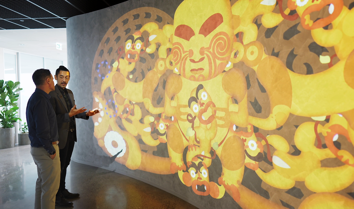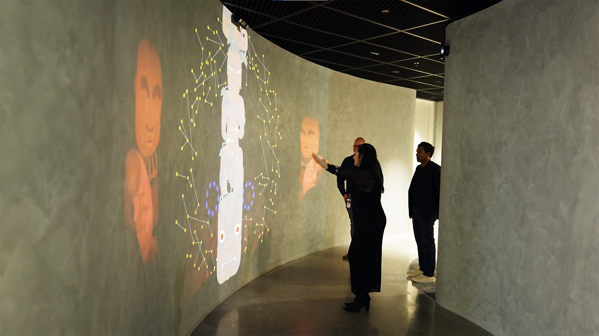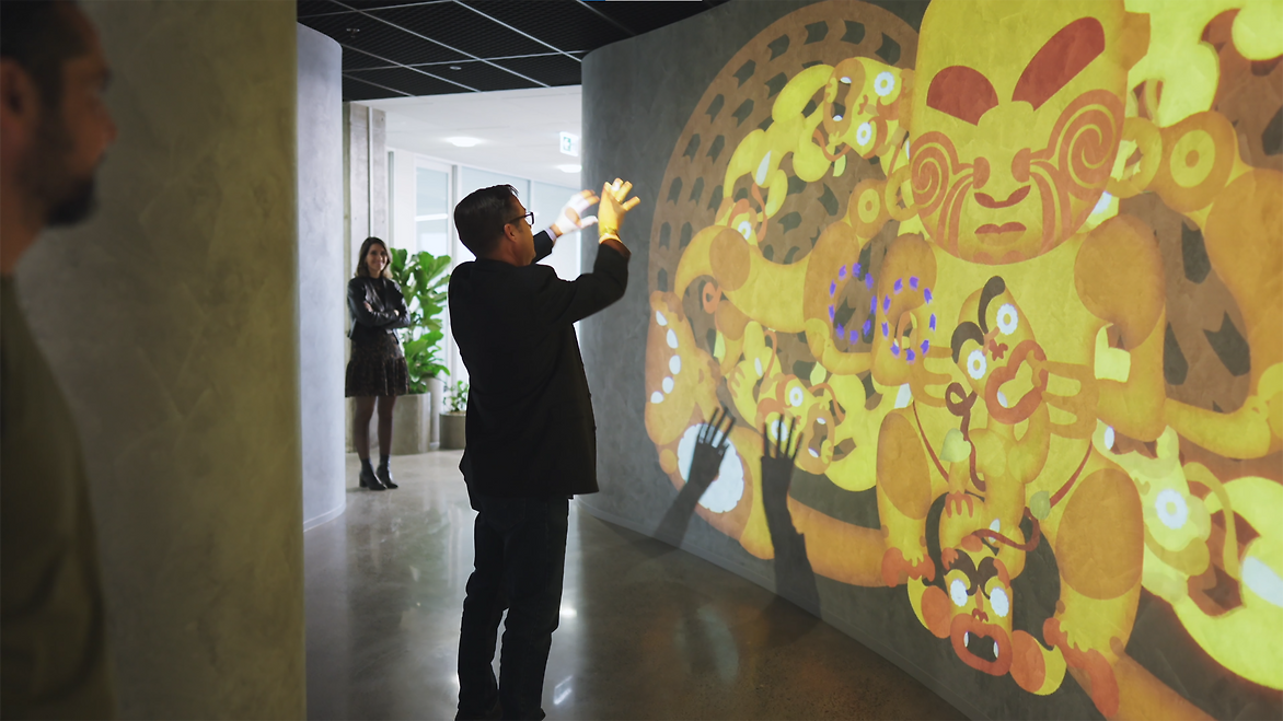 With an open brief, Microsoft NZ challenged IDIA to develop something that would capture the imagination of young Māori. We knew from the start that interactivity would play a part as the gap between the physical and digital worlds narrows. However, we didn't just want to use technology for the sake of it. We wanted the interactive elements to connect and support our ideas and stories. As we explored different ideas around technology, innovation and toi Māori, we were drawn back to the origin of our art forms, particularly whakaairo (carving). In some of our traditions, carving was brought to Te Ao Tūroa, the world of light, by Rua-te-Pupuke. In this story, Rua enters the house of Tangaroa, god of the sea, and in this house, the carvings are said to have been talking to each other. This made us think, wouldn't it be cool if we could do that with technology? If we could somehow bring our carvings to life through an installation with motion tracking and animation. With this in mind, we began to test and develop ways to create digital pou and tiki that would follow users as they interacted with the installation. For us, this would give the artworks the ihi, the wehi and wana, that sense of awe when standing in front of exceptional Māori artworks.