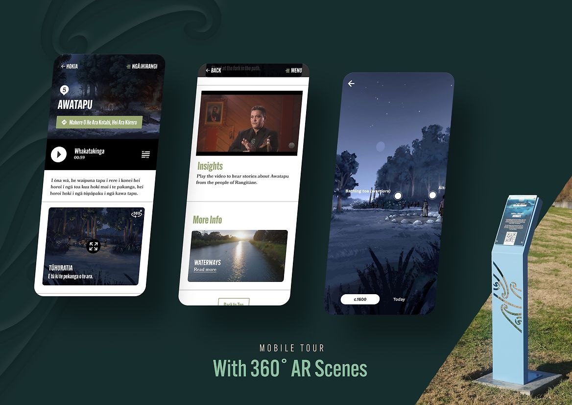 To explore sites on the mobile phone tour (hak.nz/tour), visitors scan QR codes on branded markers, to access audio overviews, articles and edited oral histories with filmed video recreations. The 360˚ augmented reality scenes reimagine the sites as they would have once looked and been utilised – including pā sites, kāinga, māra, and places for traditional ceremonies. Labelled hotspots interpret key people, items, and places in the scene.