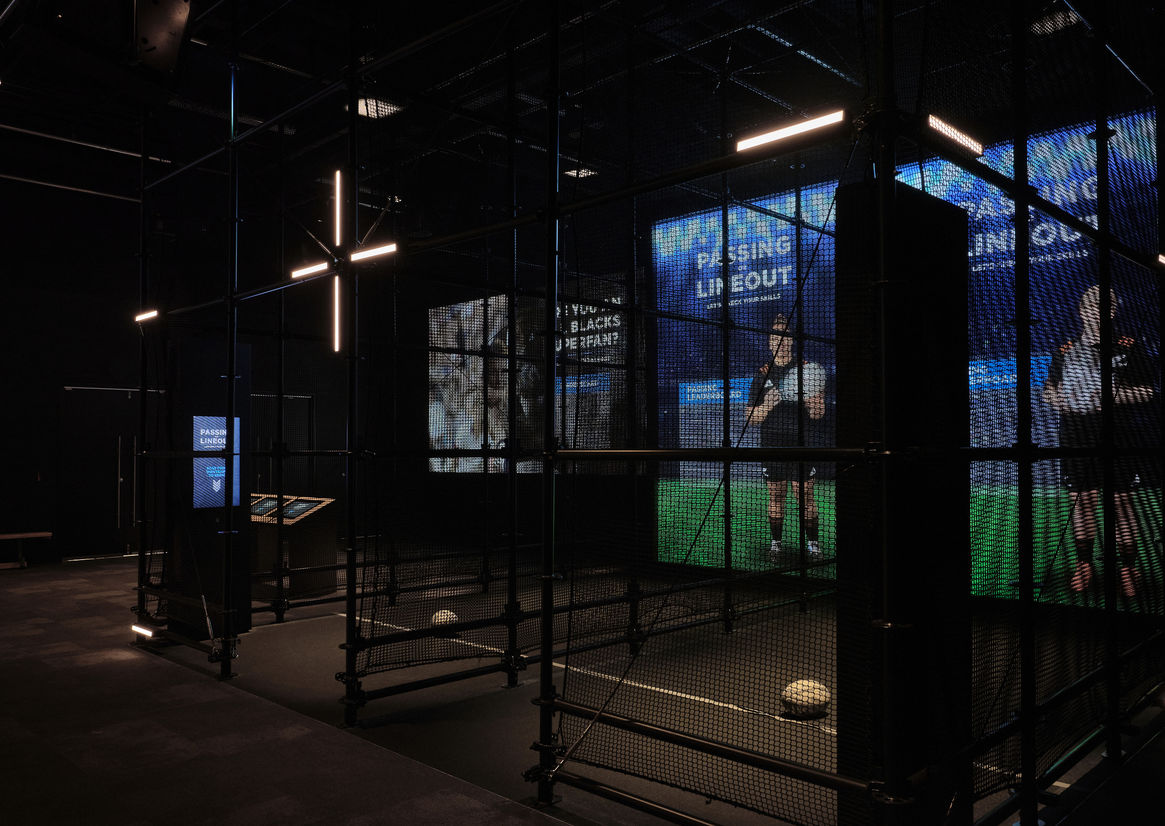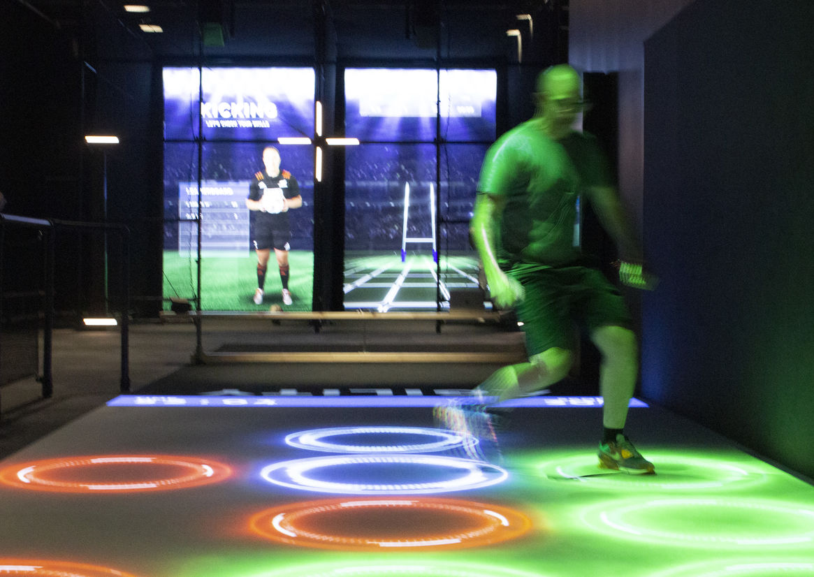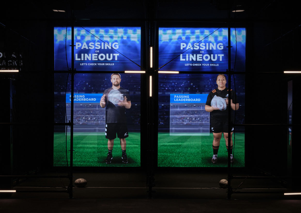 After a guided introduction to the All Blacks culture, visitors experience first-hand what it takes to make, shape and be an All Black when they compete as two teams face-to-face. Guided by previous All Blacks and coaches on screens opposite them, they go through a series of interactive, digital games dealing with mental agility, strategy, tactics and pressure — using fun and simple mechanics as well as colour and light to build pressure and intensity.