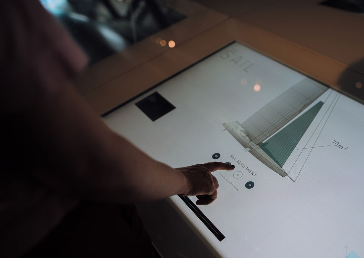 The brief was to utilise four separate 43” ELO screens, located under the NZL32, to help visitors gain a greater insight into the characteristics of an America’s Cup boat and develop a better understanding of the differences in performance brought about by new designs and prevailing wind conditions.