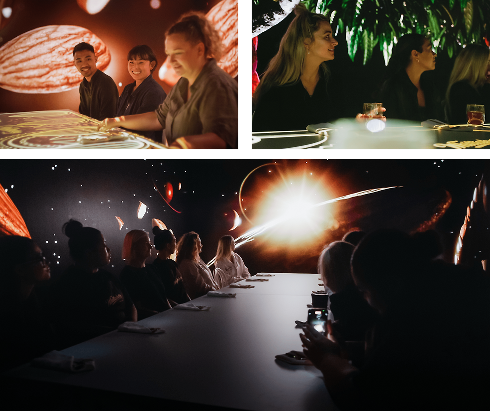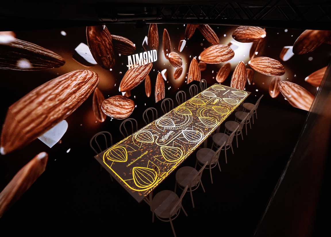 To bring the world of Whittaker’s to life, we utilised wrap-around LED panels and overhead projection to create an immersive and visually stunning dining experience. Each ingredient took centre stage, introduced through captivating screen creative and sound design. Accompanied by dishes meticulously crafted by Chef Will Mordido, the event offered a multisensory taste-testing journey that immersed guests in the flavours, aromas and textures of Whittaker’s Honey Nougat & Almond.