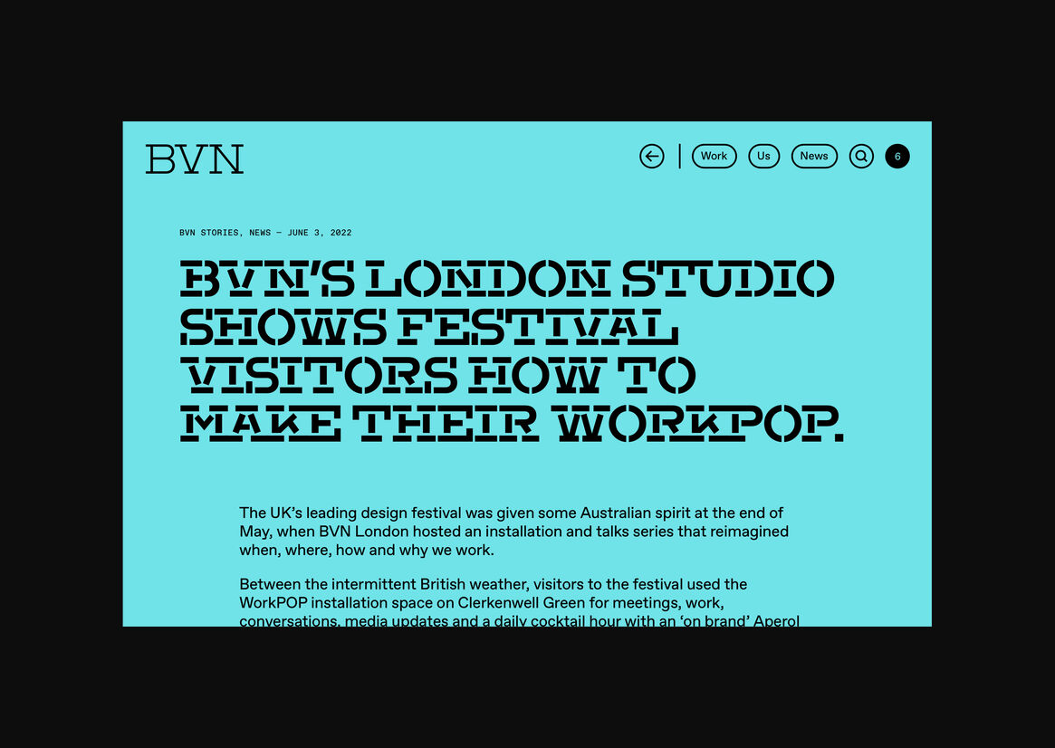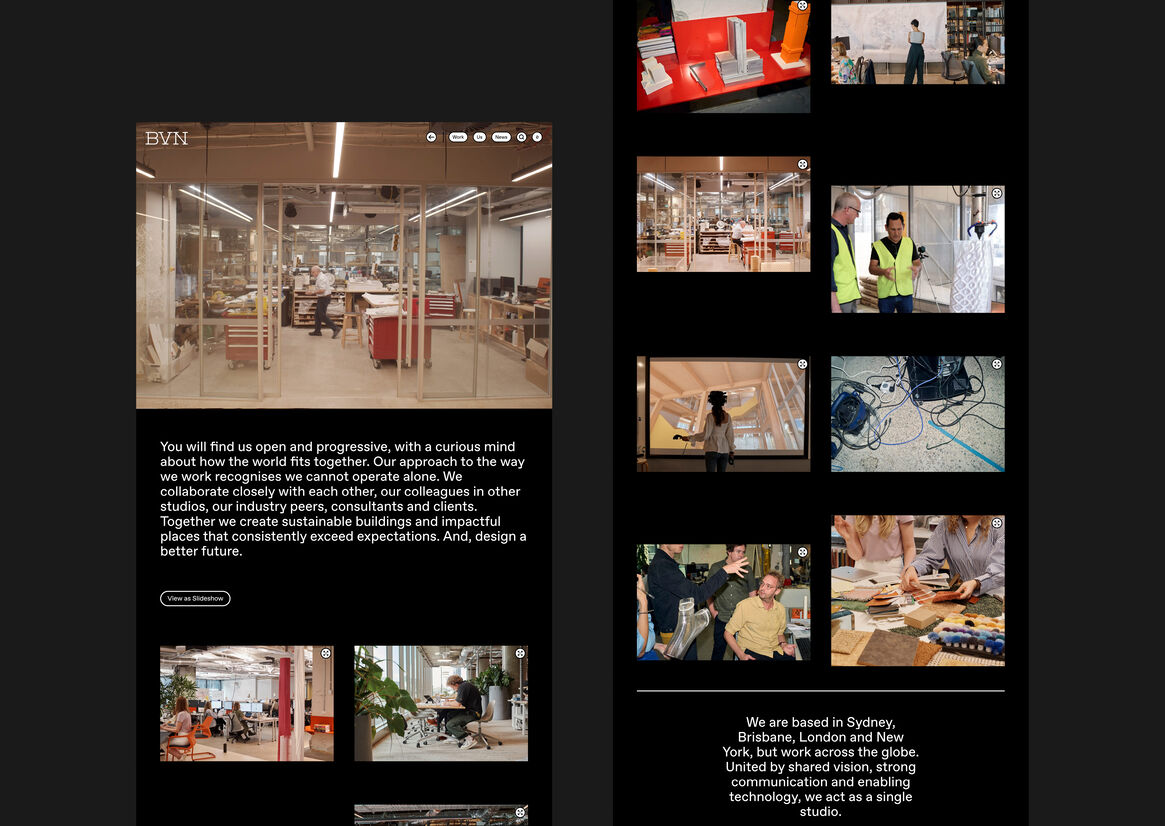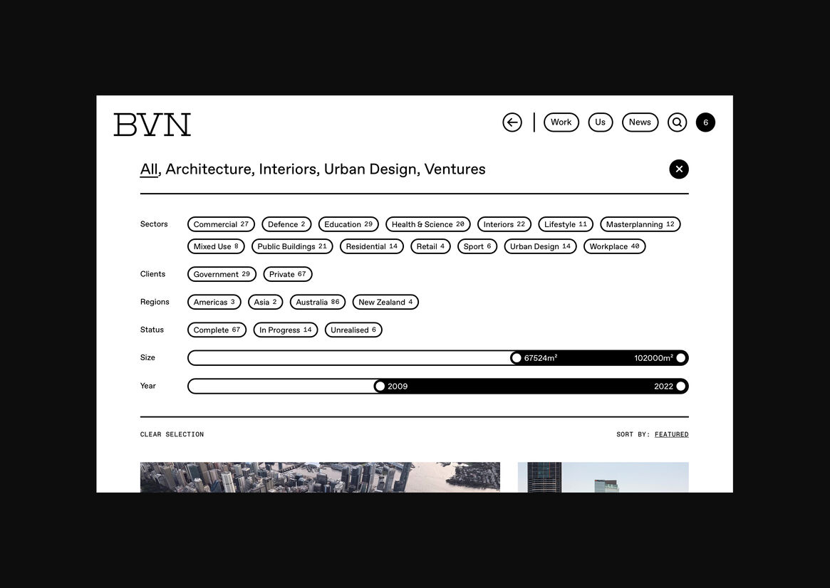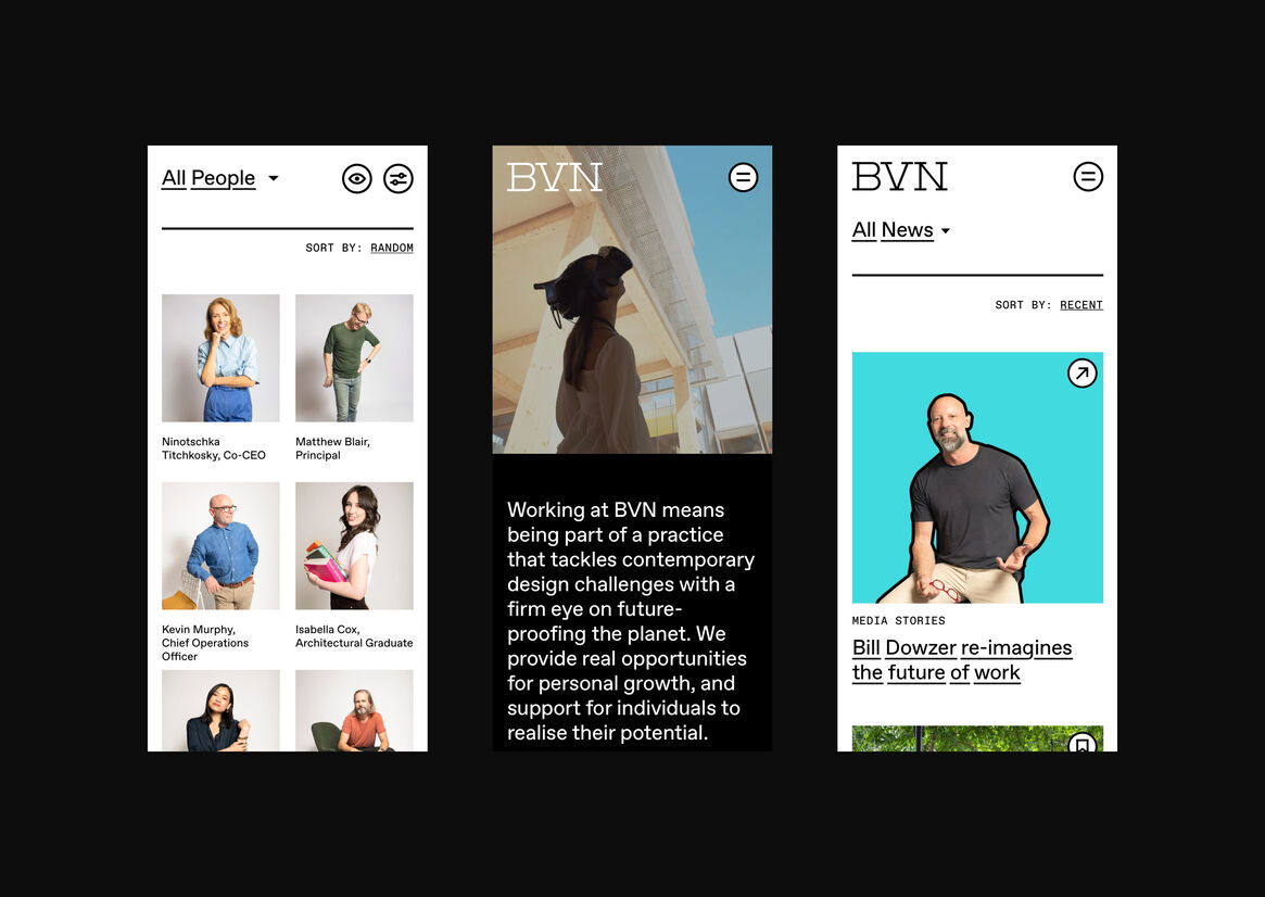 BVN is a creative collective of architects, designers, researchers and makers with offices in Sydney, Brisbane, London and New York. They approached Base in 2021 to help communicate their dynamic model of practice, and ambition to challenge expectations of architecture. Central to our work was the design and development of a new website. The website sought to bring their new brand identity and broader strategic shift to life; to grant access to the vast archive of BVN’s projects, to surface their values; and to allow the business to reach a broader audience beyond the field of architecture.