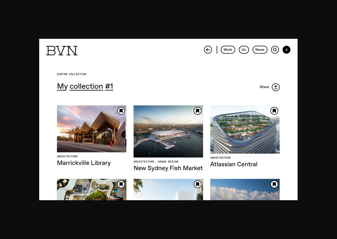 At the core of the site is the tenet module, a dynamic editorial presentation of BVNs core priorities that offers a deep understanding of their practice at a glance. By connecting projects to ideas we’re able to avoid many of the typical conventions found within architectural websites — while also ensuring audiences with limited architectural knowledge are respected and engaged. This consideration for the user is continued through the UI and UX which is developed to be fast, modular, and simple to use. One of the best examples of this is the bookmarking feature which allows collections of projects and news articles to be gathered together, read, and shared. This is particularly powerful for sharing curated content with prospective clients. Another is the dynamic filtering system developed to provide better access to their project archive.