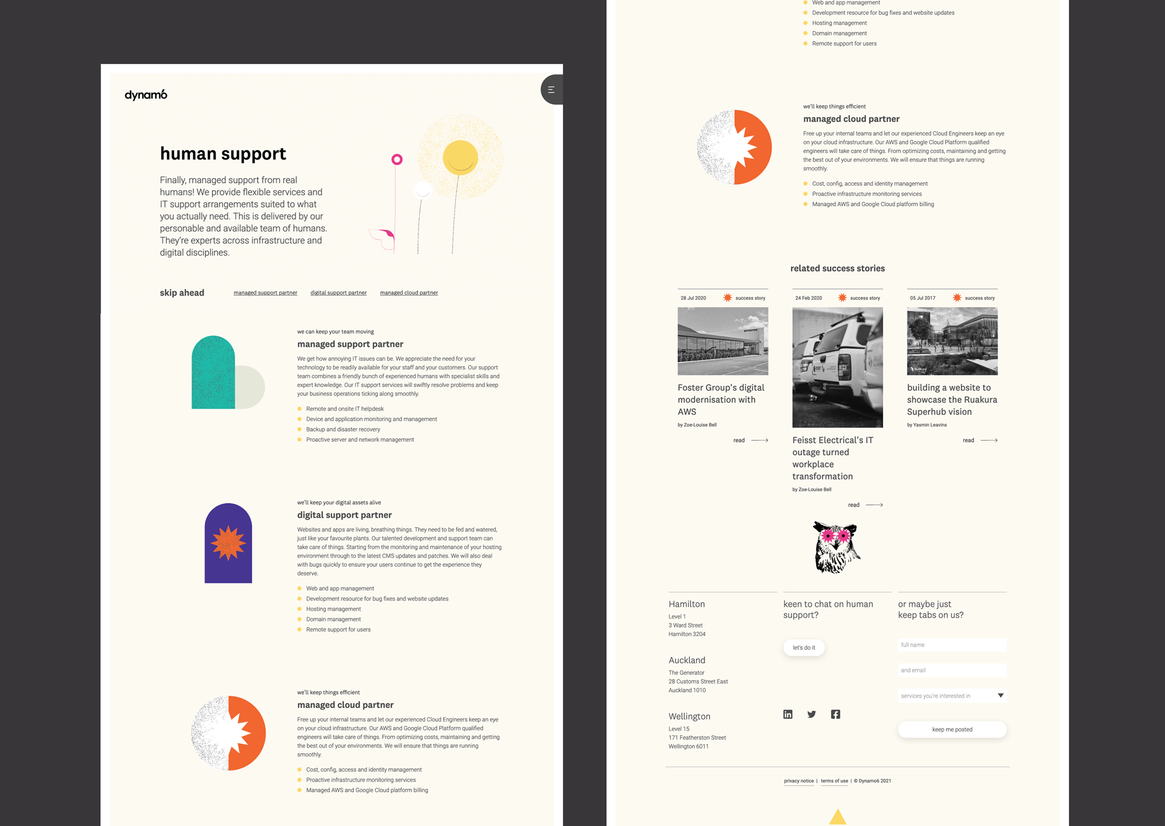 With the creative brief complete we reached out to a design duo to help us with the art direction, illustration, animation, and delivery. They took our early work and evolved it to create a visual language that made the overall website unique but could also be extended throughout our brand.