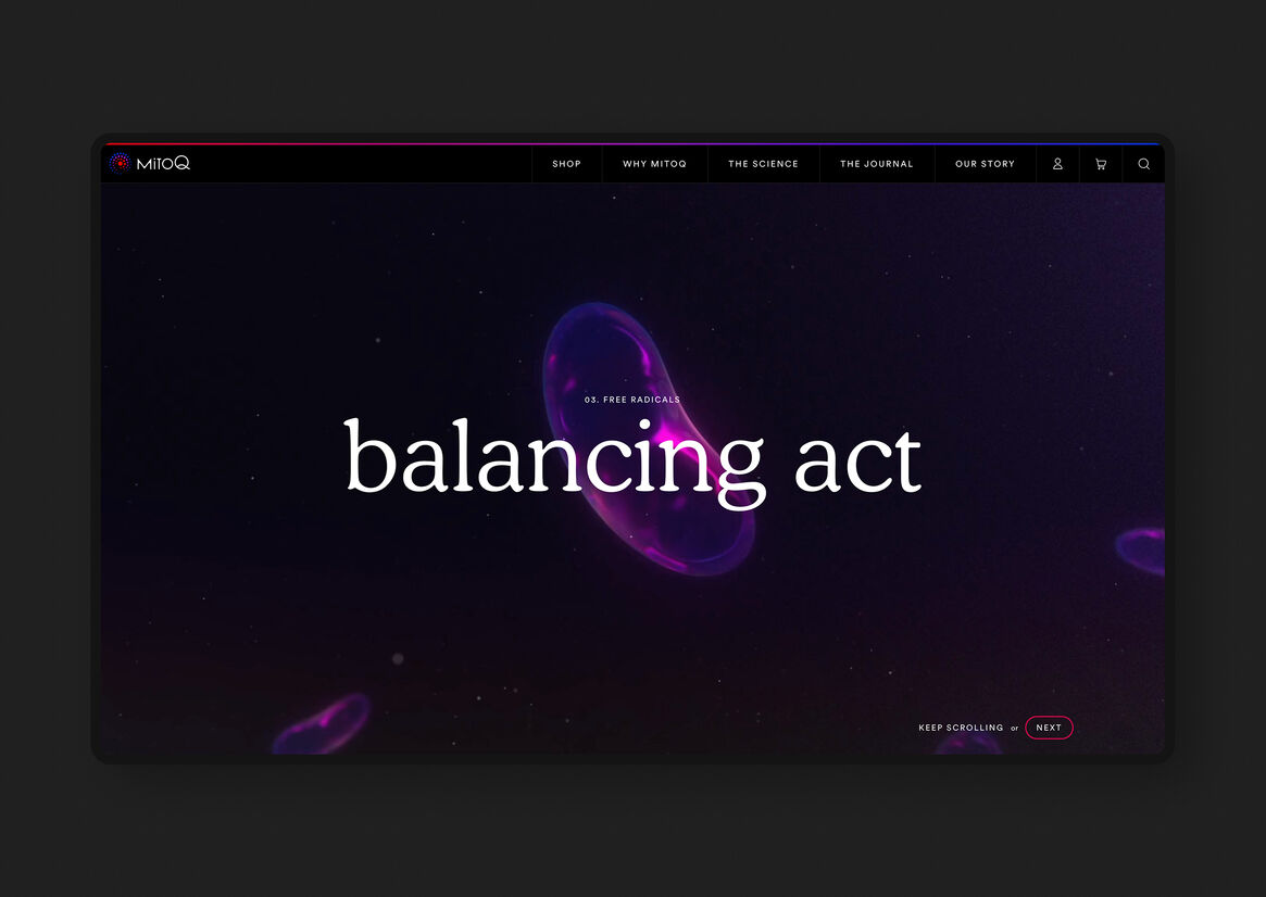 The brand work had established the language of blues and reds - where blue was the base state of your body’s cells, red was the excitement of the MitoQ molecule, and purple is the energy cascading from one to the other. We expressed this story in multiple moments throughout the site, from the backgrounds of key pages, where the red and blue slowly swirl into each other, to the CTA button rollovers, where those colours radiate outwards as you hover.