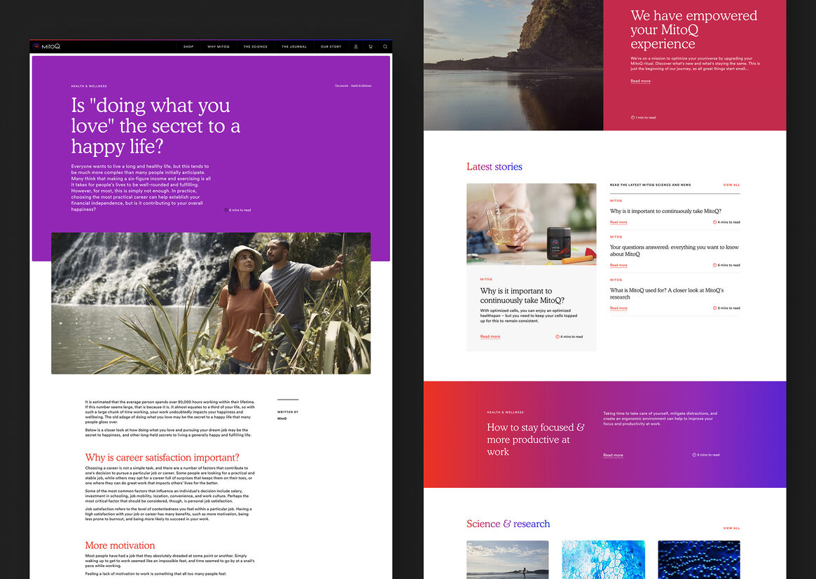 Trusted and authentic - MitoQ had spent decades building their strong scientific credentials and global customer trust. Our design had to convey trustworthiness and authenticity right from the get-go, and this had to be deeply embedded throughout the entire site.