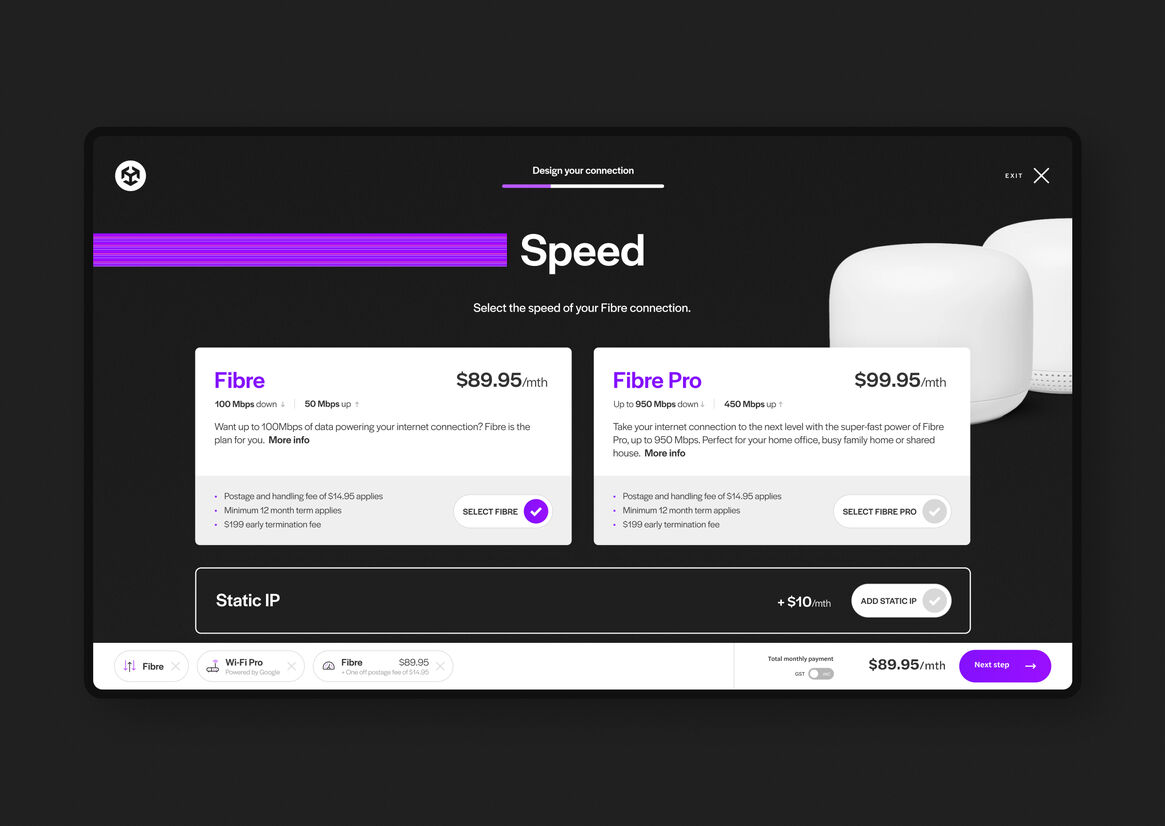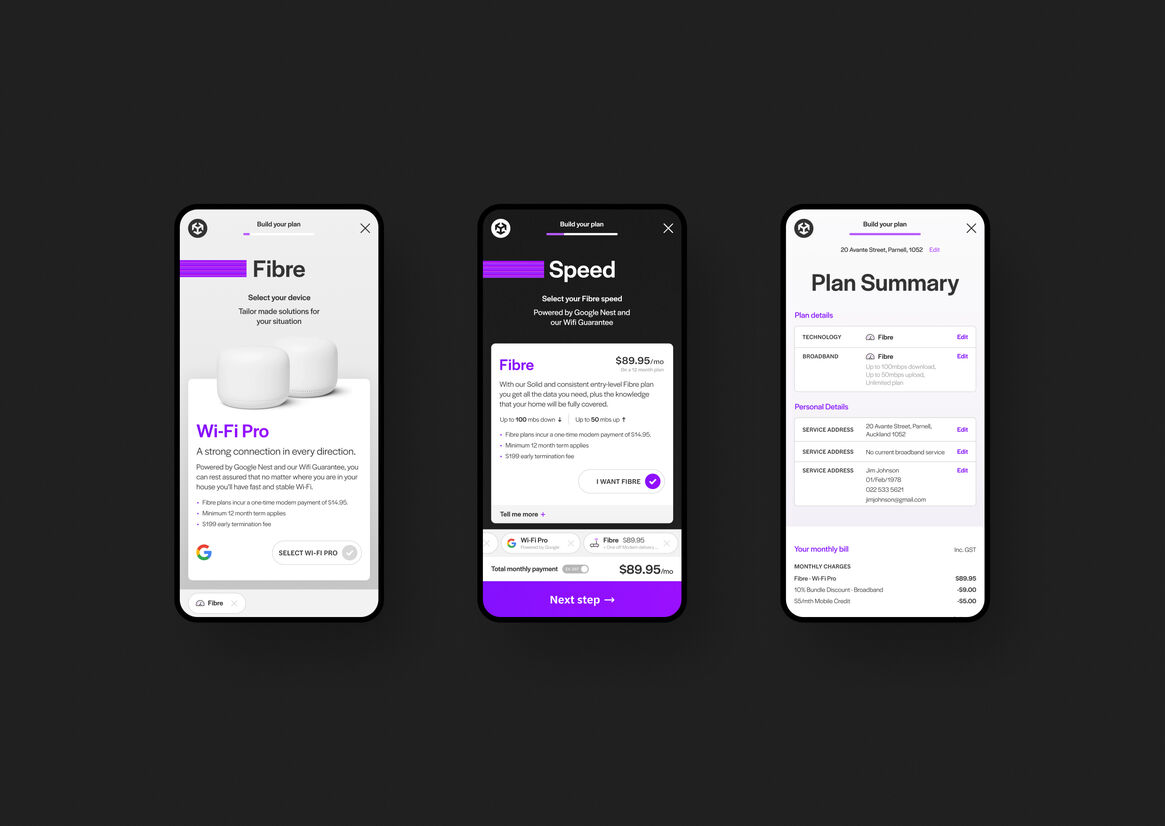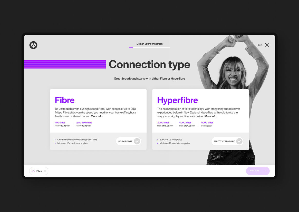 The project is structured for optimisation, with ongoing analysis driving insights for future improvements. A close analysis of historical versions of the ISP sales funnel informed a smarter user experience that allows modular optimisation and testing over time. The new dynamic sign-up puts the customer at the heart of the journey, breaking down technical jargon and common pain points, and giving the customer real flexibility and control—delivering on Orcon’s promise to make their customer feel “unstoppable”.