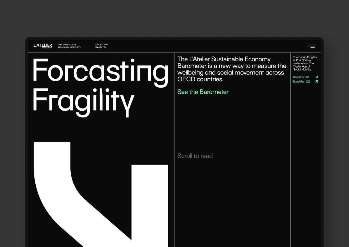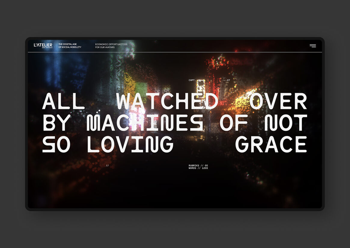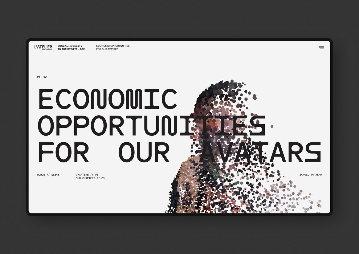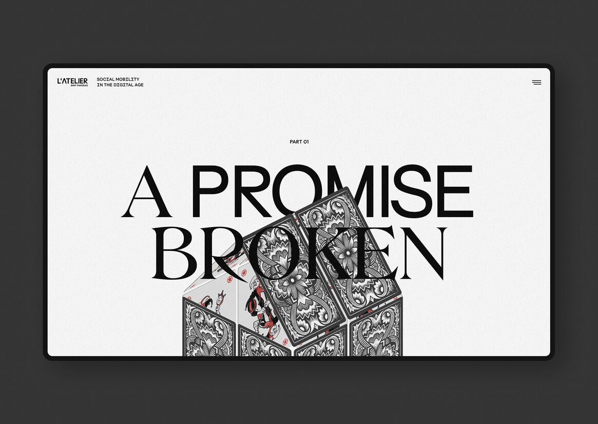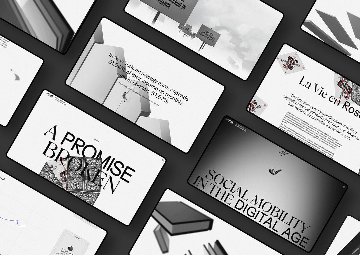 ‘Social Mobility in the Digital Age’ is the culmination of a year-long research project by Paris-based agency, L’Atelier. Told in three acts, ‘Social Mobility’ explores historical drivers of wealth inequality, the potential impact of future technologies on economic society, and comparative metrics for understanding present day threats on a global scale. The design needed to bring this scholarly text to life, and add emotional weight to the experience.