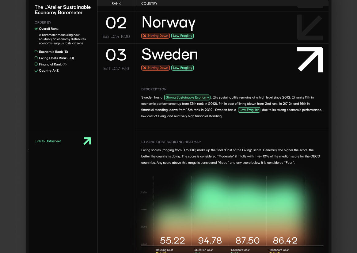 Act III: ‘Forecasting Fragility’, is the heart of the research story. Analysts brought together sources of economic and social data to develop their own original social mobility score. The challenge was to visualise this information in a way that wouldn’t overwhelm the reader with complexity, but made methodology accessible and clear. Importantly, a global audience needed to be able to compare and contrast their own country’s performance with the rest of the world.