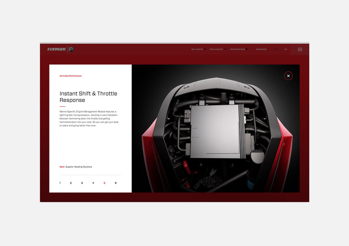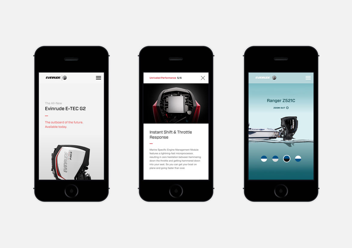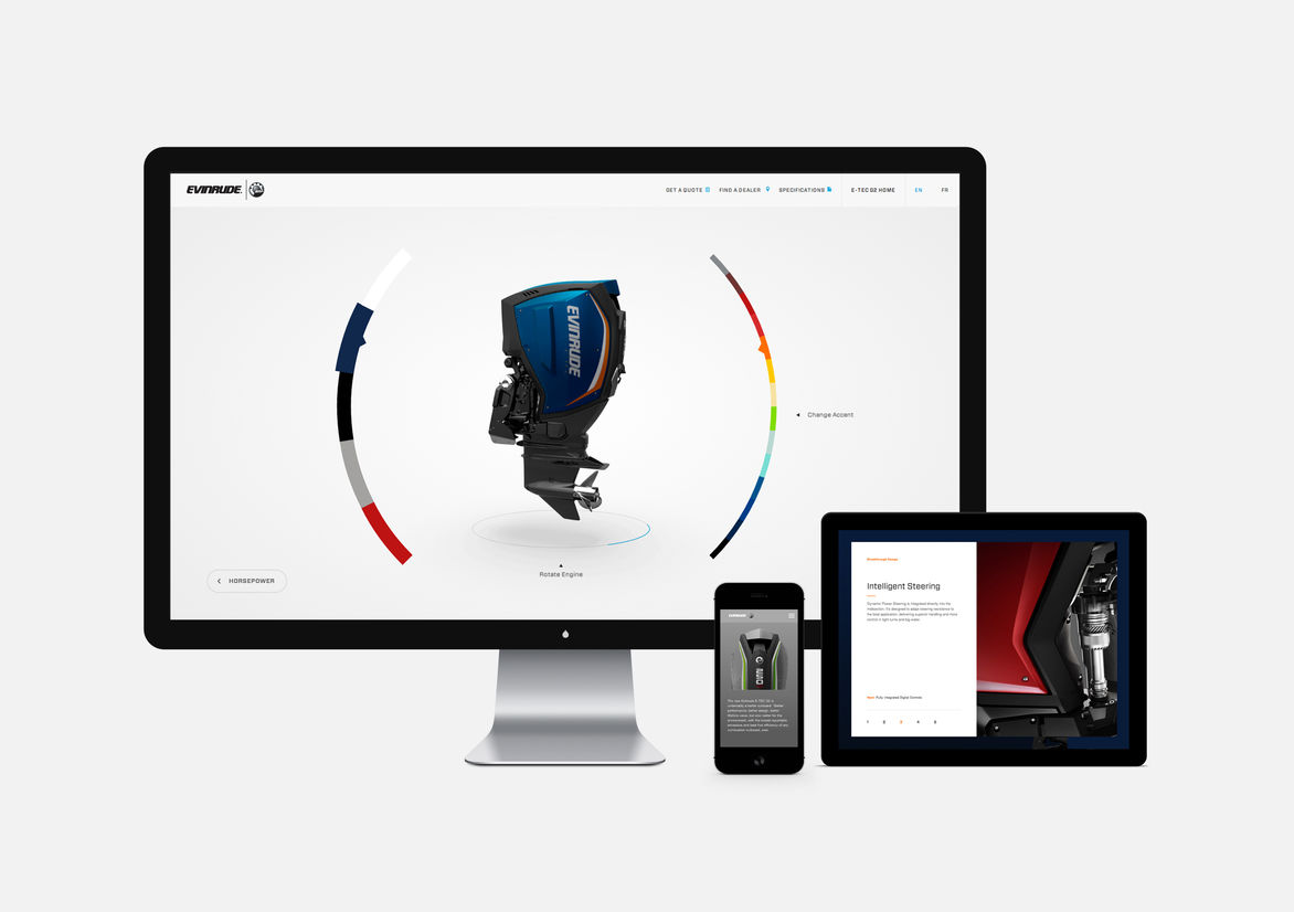 Technology brochureware done right, for a new line of outboard motors. Craft and detailed flourishes abound.