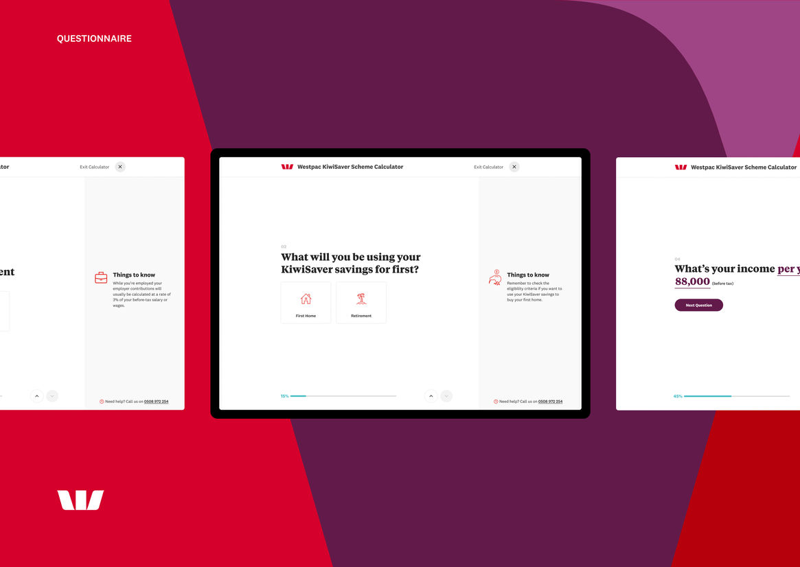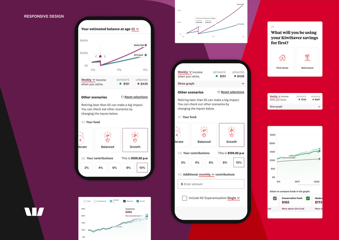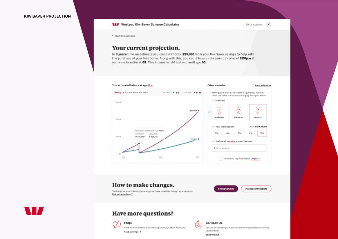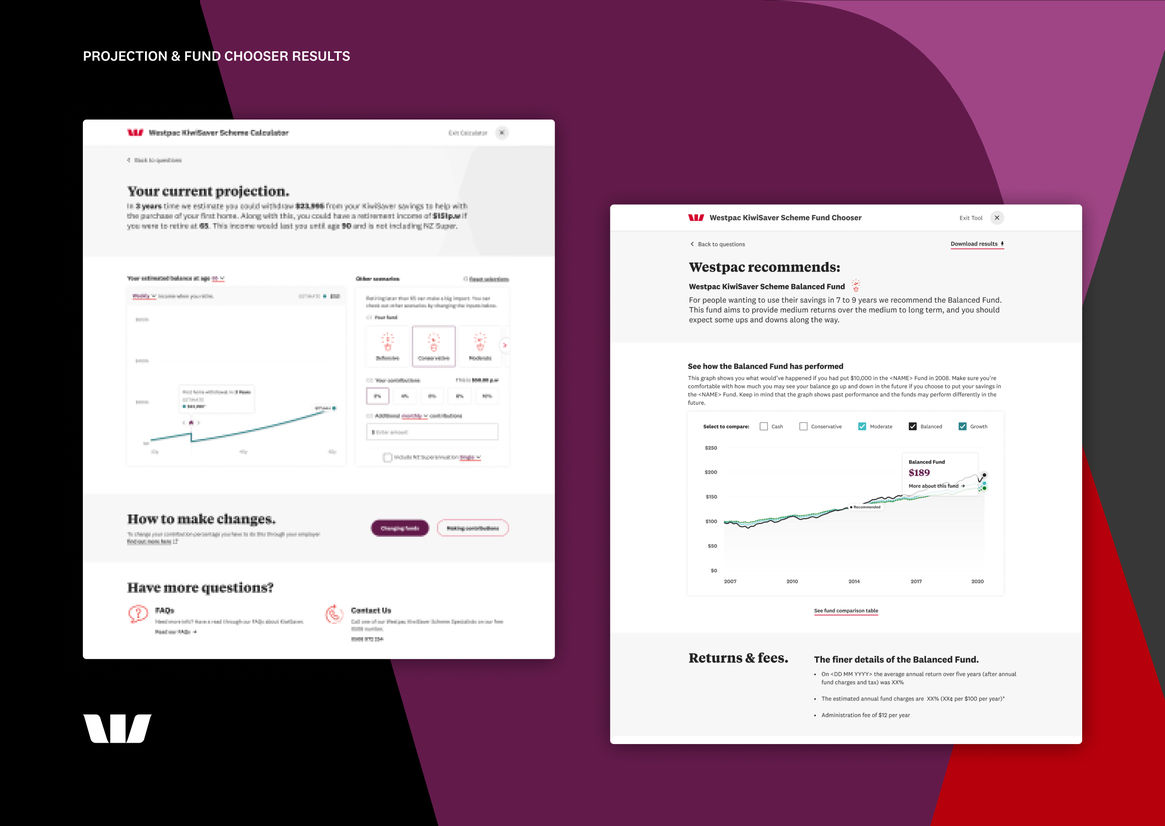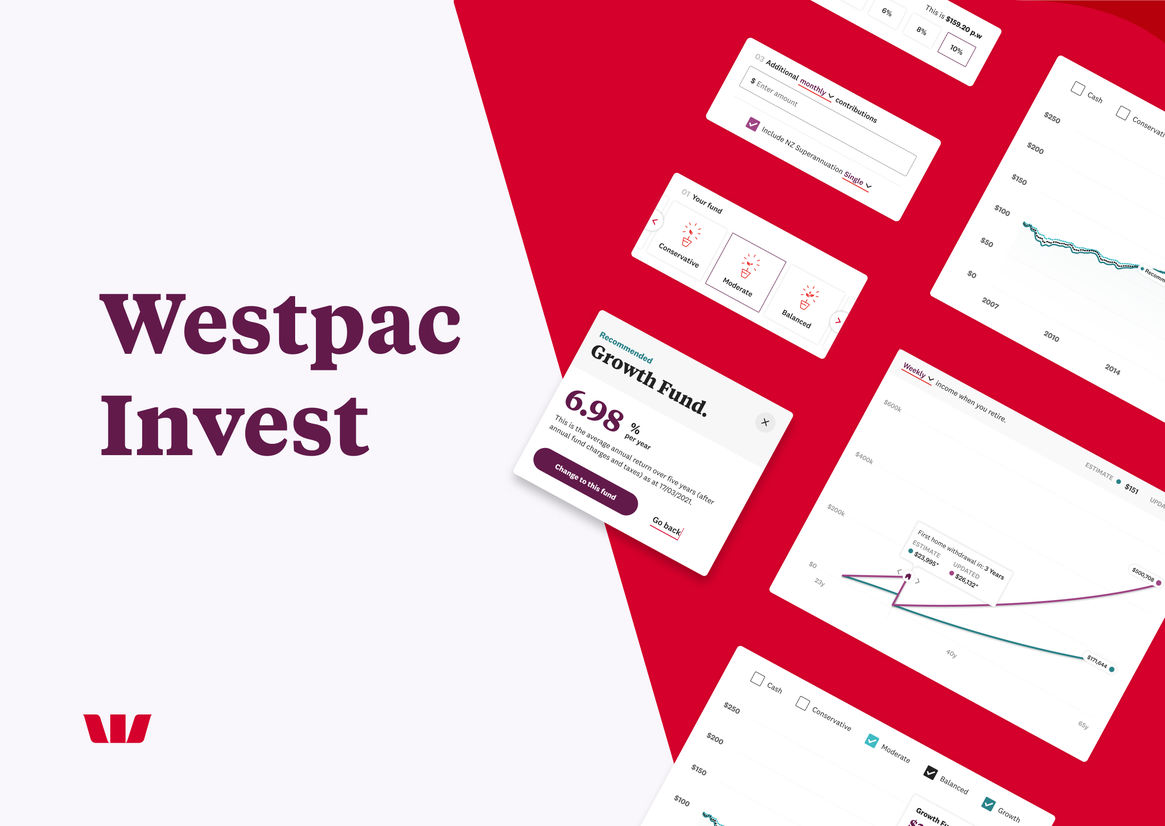 As one of New Zealand’s largest banks, Westpac offers its customers multiple investment options, including KiwiSaver, a voluntary savings scheme to help set New Zealanders up for retirement. Westpac’s internal research found that a significant number of KiwiSaver customers didn’t fully understand their fund choices. So they engaged us to design and develop two digital tools (a Fund Chooser and Projection Calculator) to help educate KiwiSaver customers and enable them to make more informed decisions.