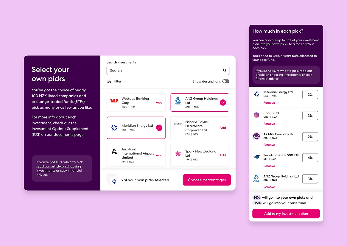 For the first time in a simple way, everyday Kiwis can easily add individual companies and funds to their investment plan, and have more say in where their future is invested.