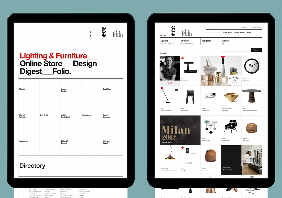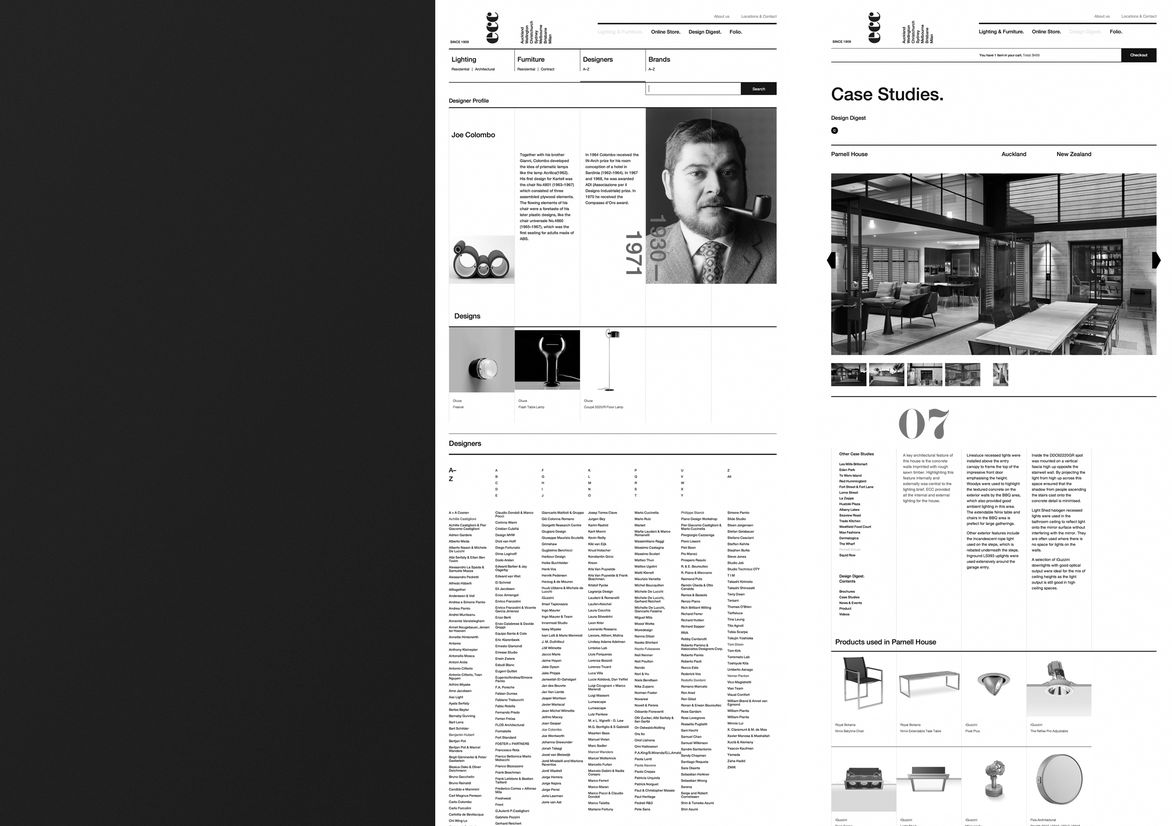 Digital Digital Campaigns Digital Products E-Commerce Websites (new 2024) Game Design Installation & Exhibition Large Scale Websites Small Scale Websites Student Digital User Experience (archived 2022) Animation Digital — formerly Interactive (2010–2019) Film Graphic Moving Image (archived 2025) Product Social Good Award Spatial Toitanga Value of Design Award User Experience Award (archived 2019) All categories Digital Campaigns Digital Products E-Commerce Websites (new 2024) Game Design Installation & Exhibition Large Scale Websites Small Scale Websites Student Digital User Experience (archived 2022) All years 2025 2024 2023 2022 2021 2020 2019 2018 2017 2016 2015 2014 2013 2012 2011 2010 Studio A-Z Sons & Co. 137 ECC 2013 Large Scale Websites Credits Ringatoi Matua / Design Director Timothy Kelleher Ngā Kaimahi / Team Members Matthew Arnold, Matthew Wilson, Andrew Brehaut Client ECC Lighting & Furniture