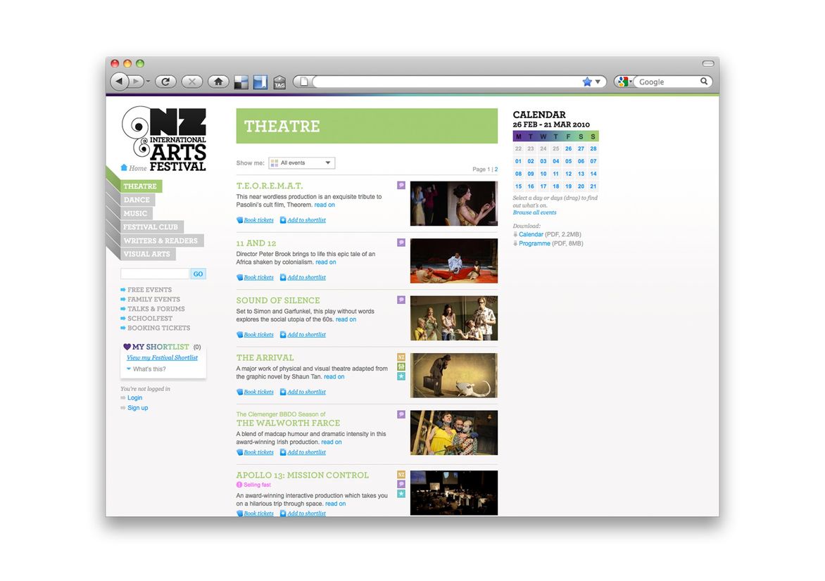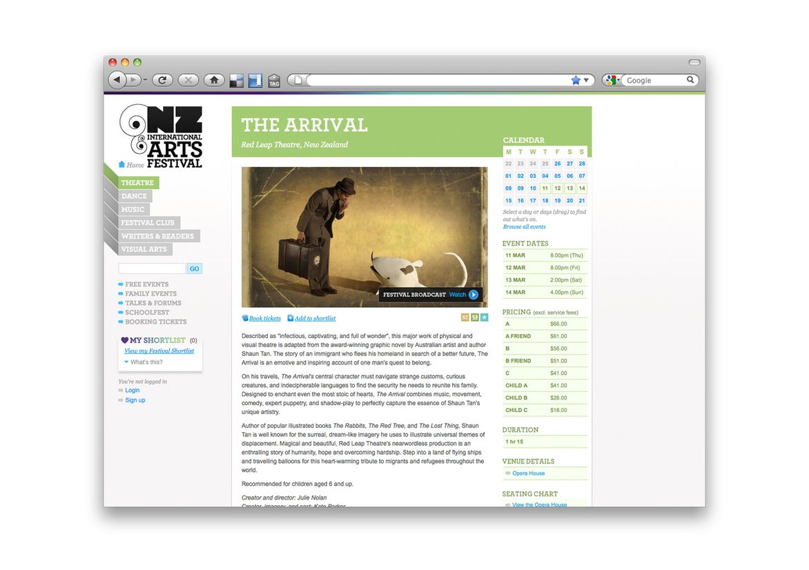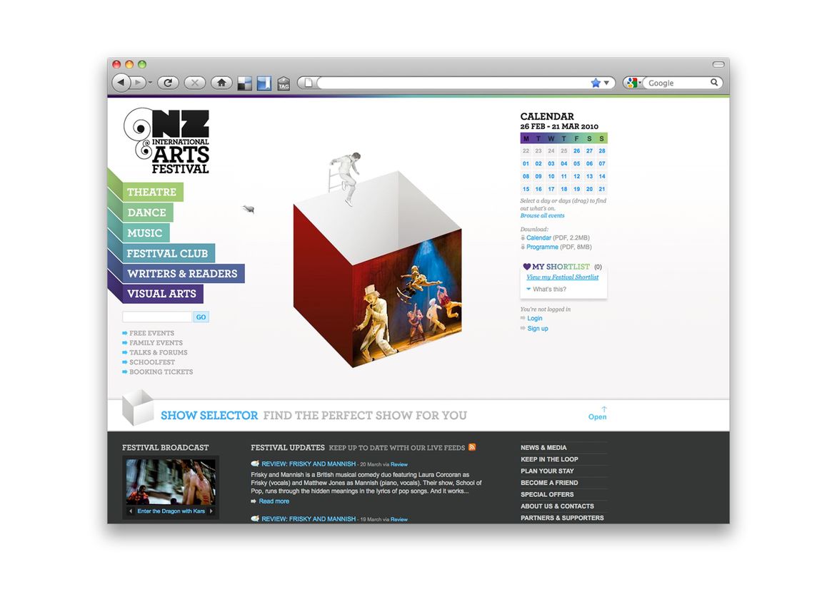 Digital Digital Campaigns Digital Products E-Commerce Websites (new 2024) Game Design Installation & Exhibition Large Scale Websites Small Scale Websites Student Digital User Experience (archived 2022) Animation Digital — formerly Interactive (2010–2019) Film Graphic Moving Image (archived 2025) Product Social Good Award Spatial Toitanga Value of Design Award User Experience Award (archived 2019) All categories Digital Campaigns Digital Products E-Commerce Websites (new 2024) Game Design Installation & Exhibition Large Scale Websites Small Scale Websites Student Digital User Experience (archived 2022) All years 2025 2024 2023 2022 2021 2020 2019 2018 2017 2016 2015 2014 2013 2012 2011 2010 Studio A-Z Springload 37 New Zealand International Arts Festival 2010 Large Scale Websites Credits Ringatoi Matua / Design Director Bron Thomson Ngā Kaimahi / Team Member Marcus Josty Client New Zealand International Arts Festival