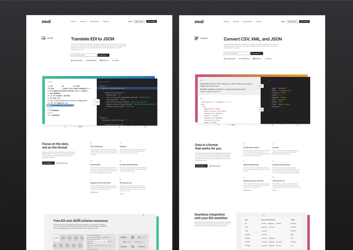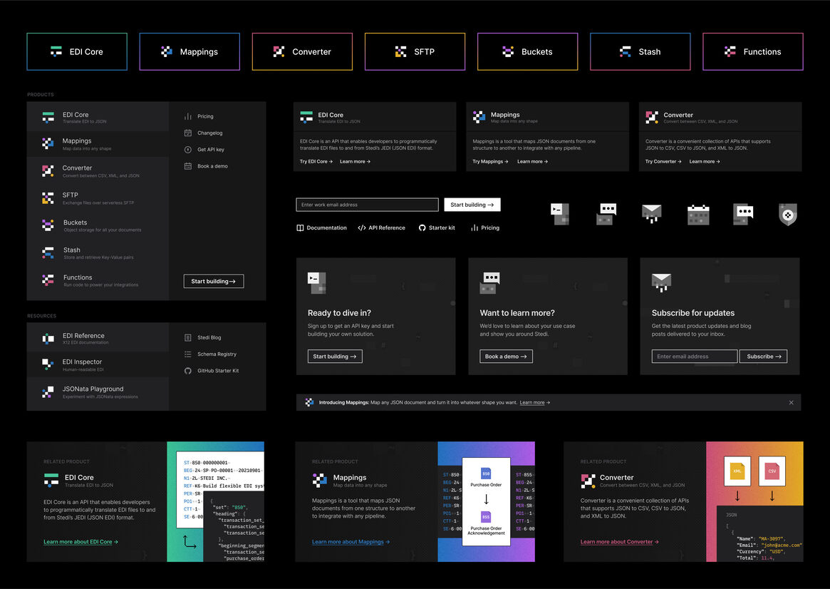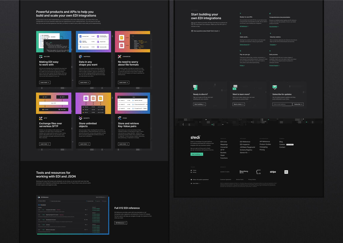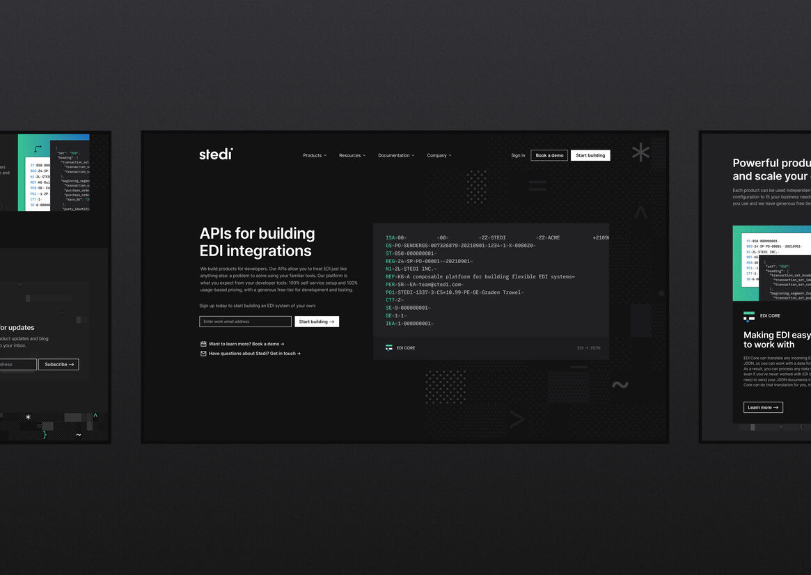 The primary audience of the site is developers who are looking for products to make working with EDI easier. This requires a design direction that is relatable to the audience and similar to the tools they’re familiar with. By using colour, illustrations, diagrams, patterns (affectionately called EDI-fetti), and typographic glyphs/characters (~ * + % $ } / = etc.) the elements pay homage to EDI and code as part of Stedi’s core visual language. The illustrations abstract the products and show what each individual API is capable of, as well as highlighting what they can do when combined. With limited visual interfaces for the APIs, these illustrations, product icons, and individual colour themes help uniquely brand our tools, while communicating what they do.