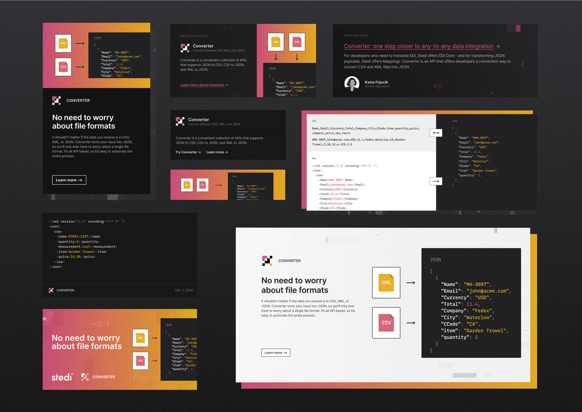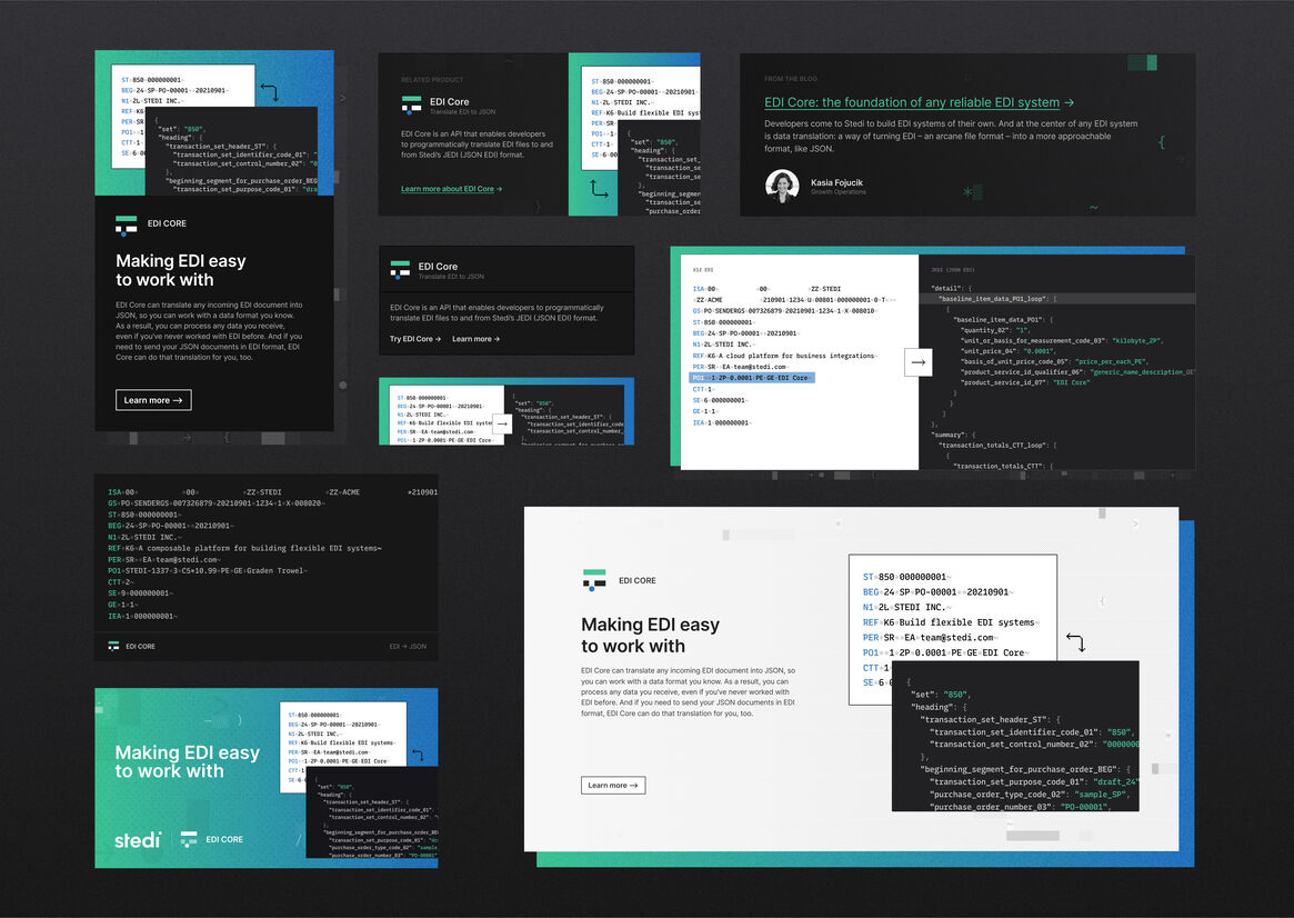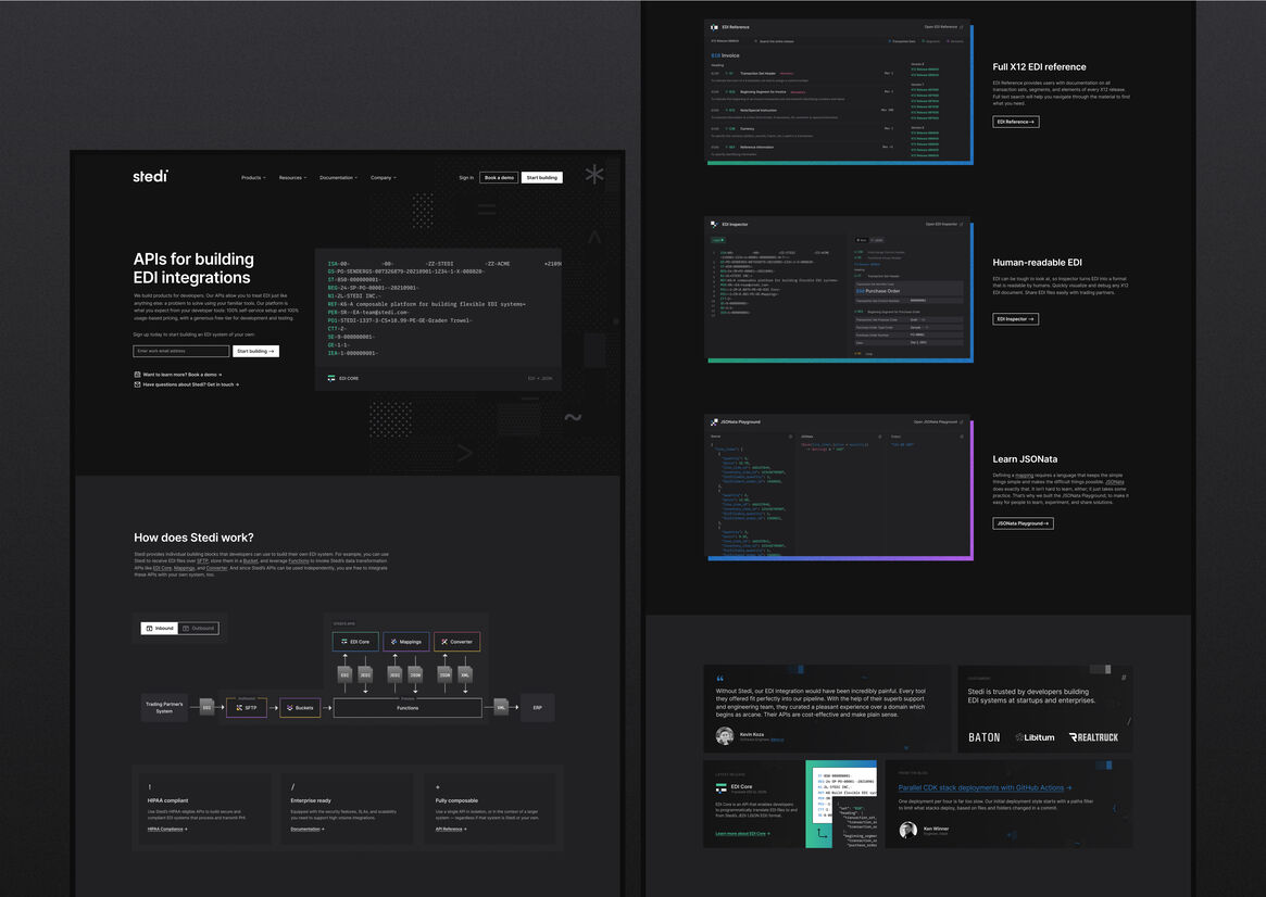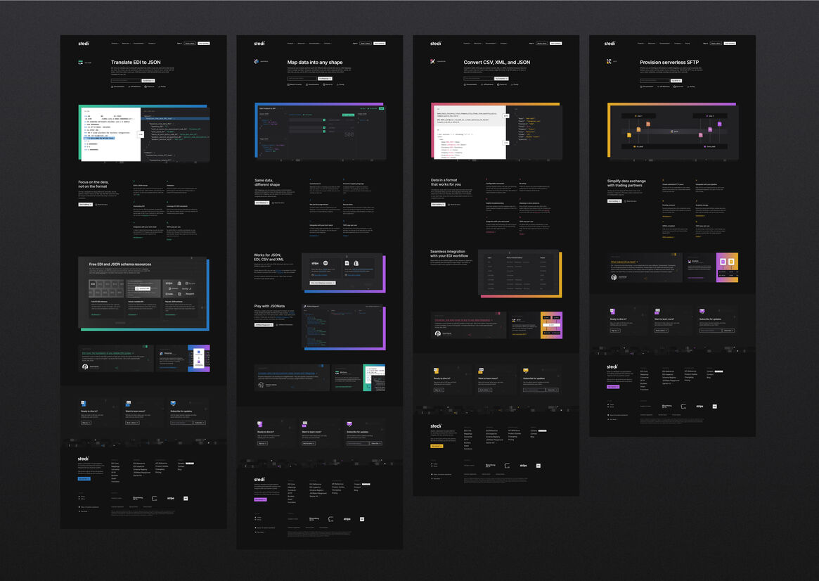 The primary audience of the site is developers who are looking for products to make working with EDI easier. This requires a design direction that is relatable to the audience and similar to the tools they’re familiar with. By using colour, illustrations, diagrams, patterns (affectionately called EDI-fetti), and typographic glyphs/characters (~ * + % $ } / = etc.) the elements pay homage to EDI and code as part of Stedi’s core visual language. The illustrations abstract the products and show what each individual API is capable of, as well as highlighting what they can do when combined. With limited visual interfaces for the APIs, these illustrations, product icons, and individual colour themes help uniquely brand our tools, while communicating what they do.