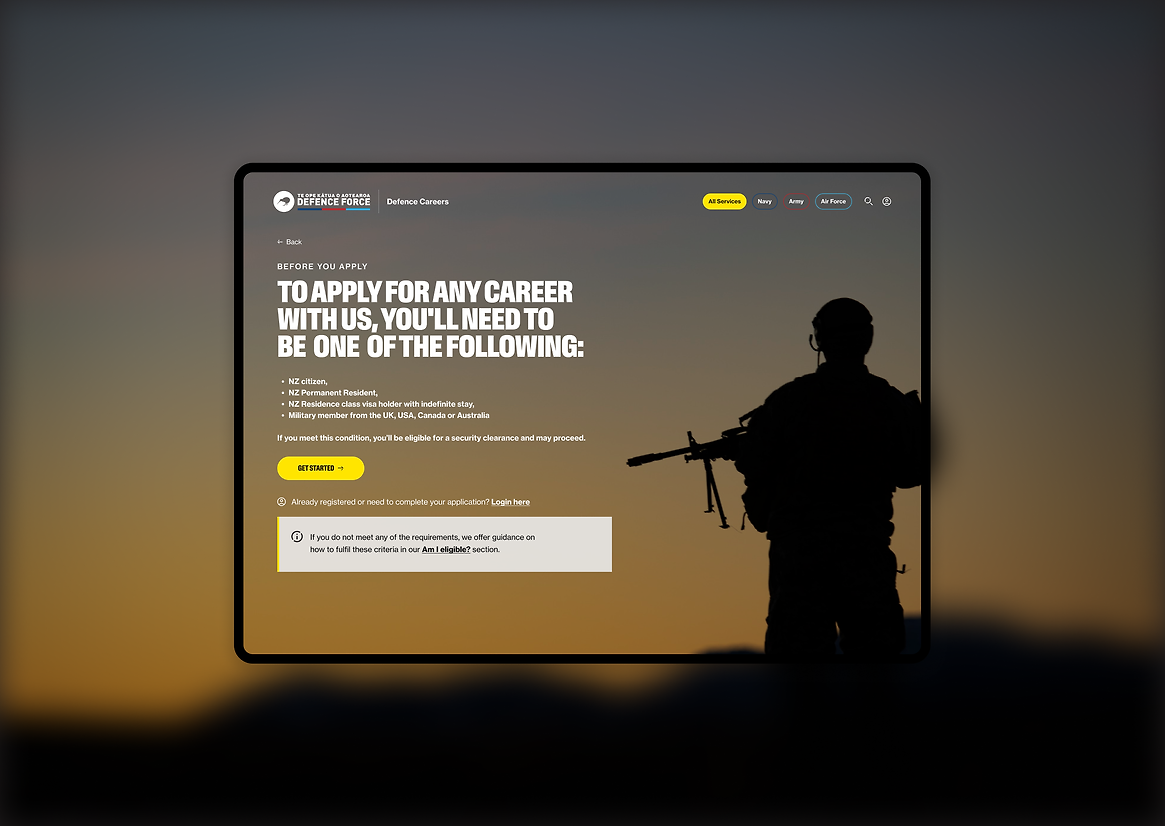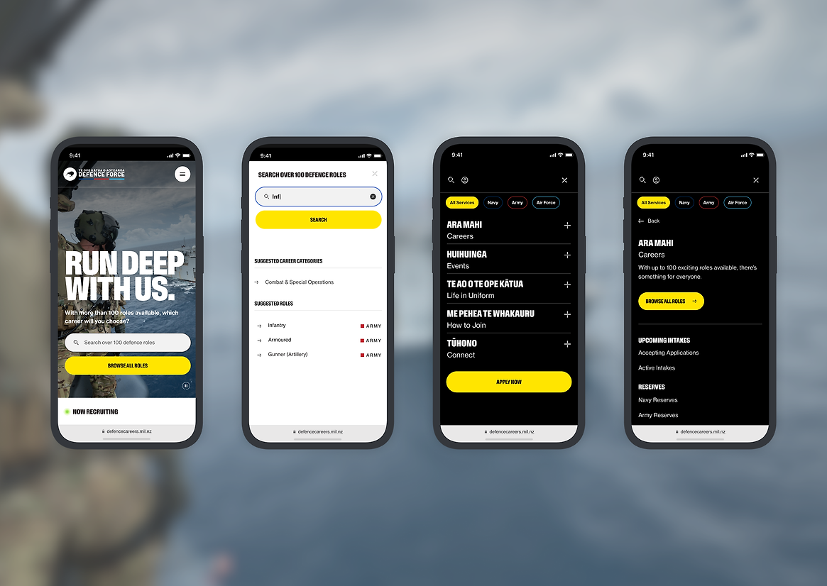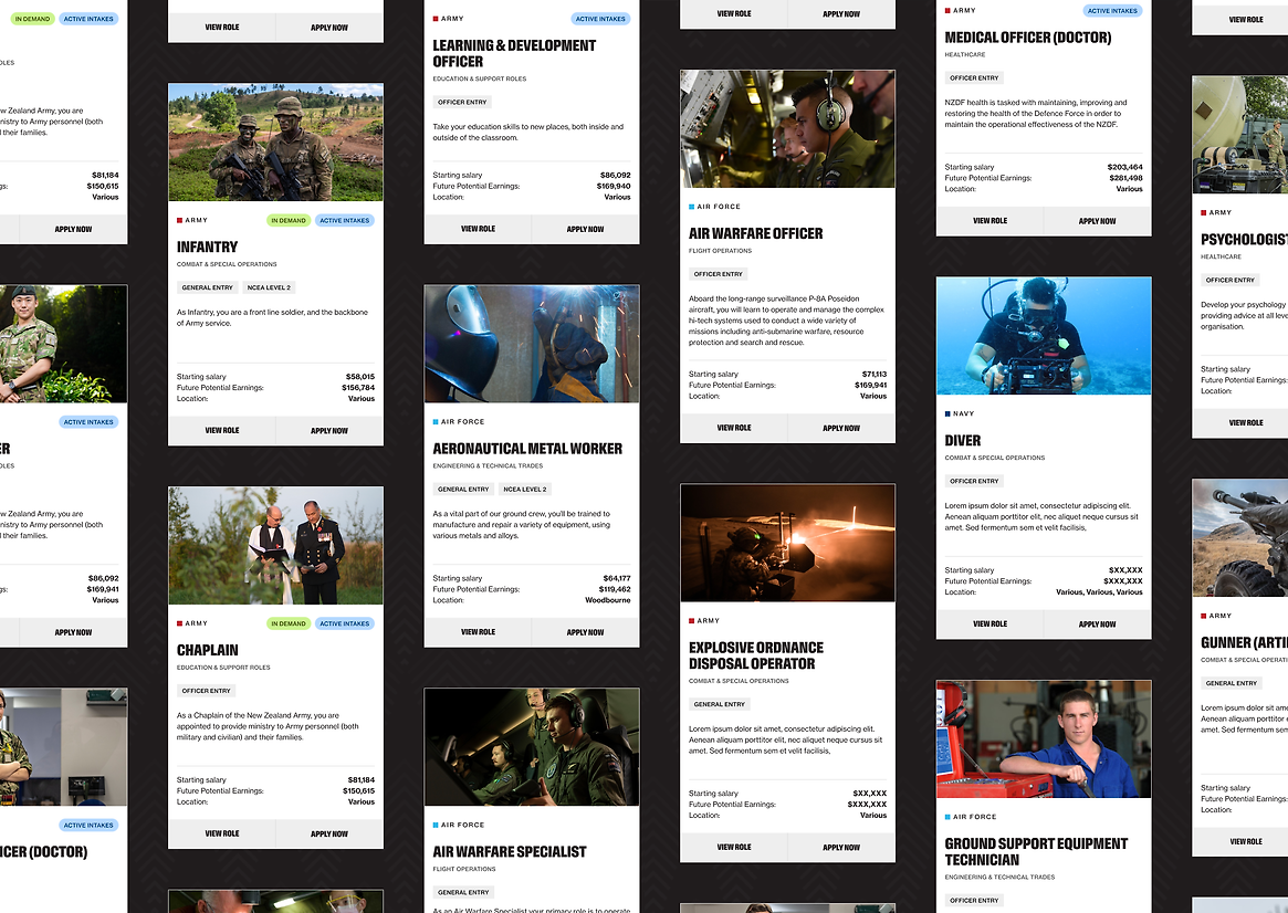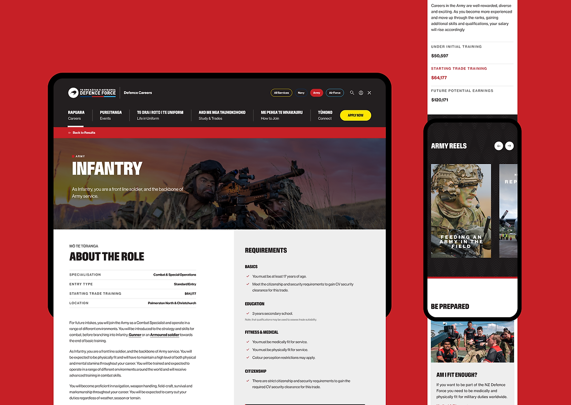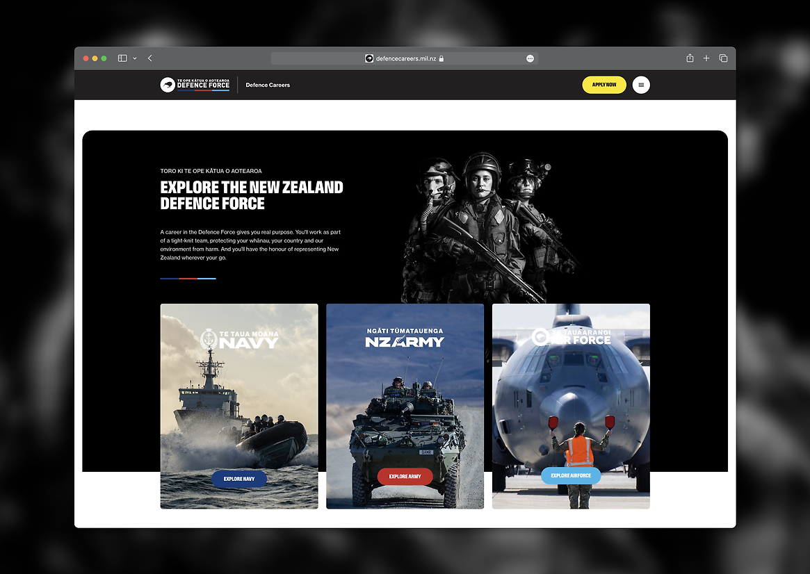 Picture this: the New Zealand Defence Force (NZDF) employs aircraft systems technicians, chefs, cyber specialists, photographers and so much more, yet most Kiwis only think of traditional military roles - soldiers, pilots, or sailors. This narrow perception meant many potential recruits weren't aware of the incredible breadth of specialised trades available, or the diverse opportunities for growth and development within each career path. Meanwhile, an outdated website experience made it challenging for job seekers to easily discover and explore these opportunities.