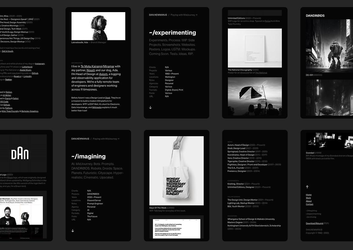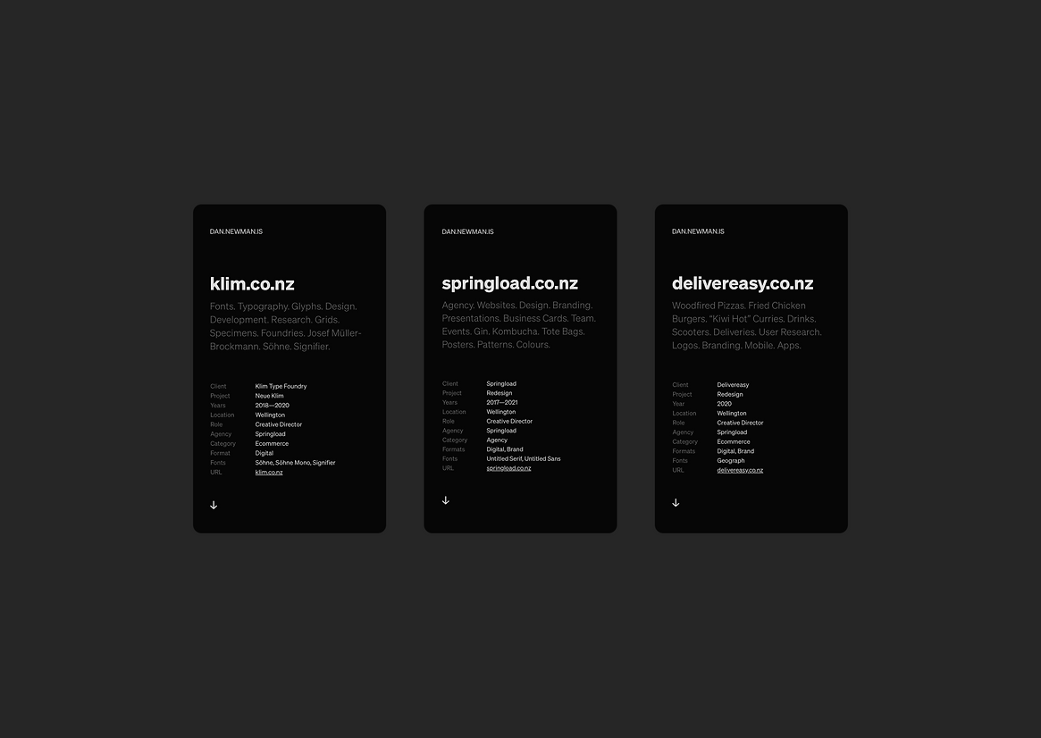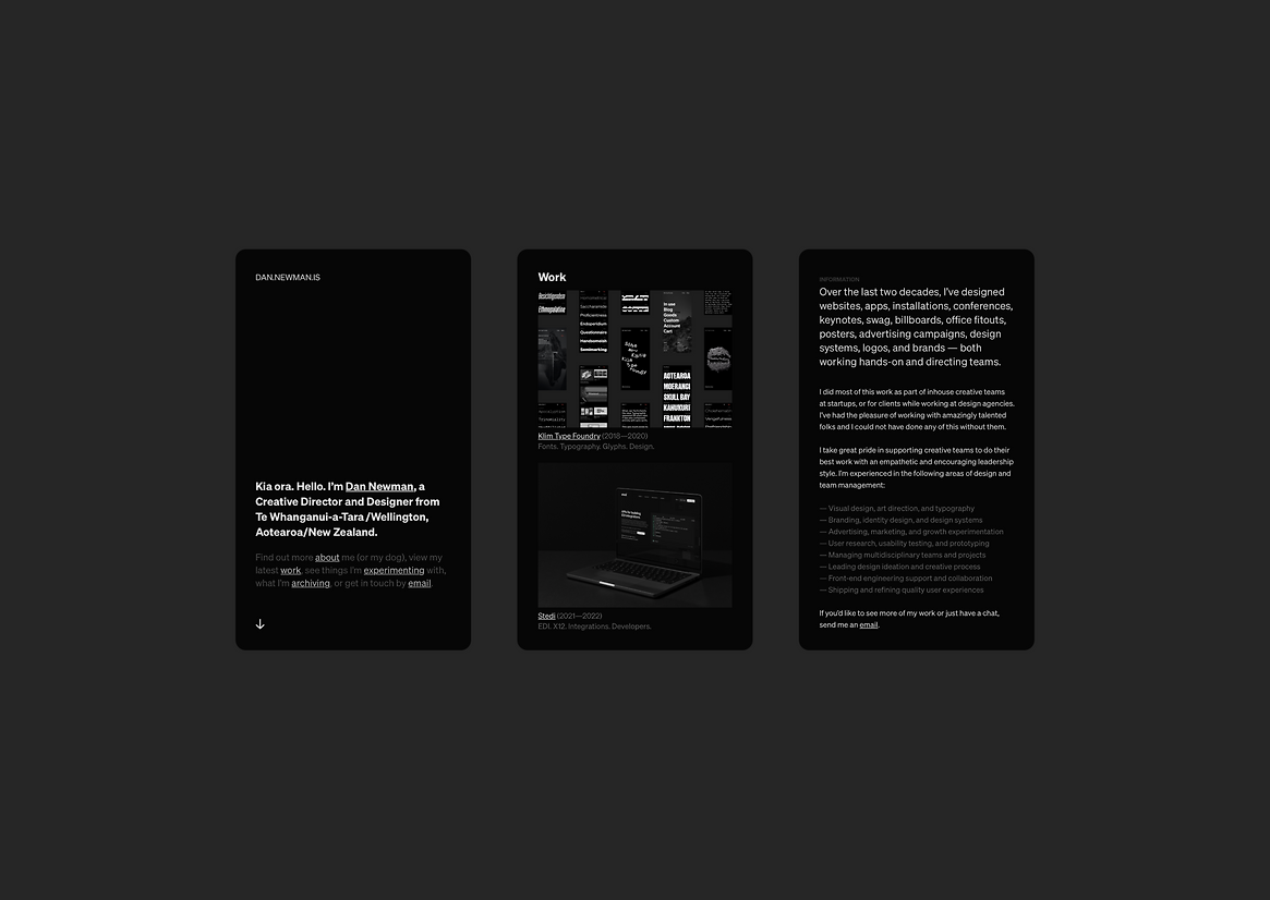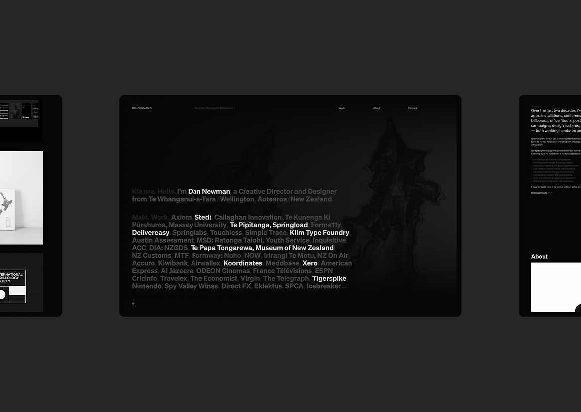 Digital Digital Campaigns Digital Products E-Commerce Websites (new 2024) Game Design Installation & Exhibition Large Scale Websites Small Scale Websites Student Digital User Experience (archived 2022) Animation Digital — formerly Interactive (2010–2019) Film Graphic Moving Image (archived 2025) Product Social Good Award Spatial Toitanga Value of Design Award User Experience Award (archived 2019) All categories Digital Campaigns Digital Products E-Commerce Websites (new 2024) Game Design Installation & Exhibition Large Scale Websites Small Scale Websites Student Digital User Experience (archived 2022) All years 2025 2024 2023 2022 2021 2020 2019 2018 2017 2016 2015 2014 2013 2012 2011 2010 Studio A-Z Dan Newman dan.newman.is Finalist 2023 Small Scale Websites Credits Pou Auaha / Creative Director Dan Newman
