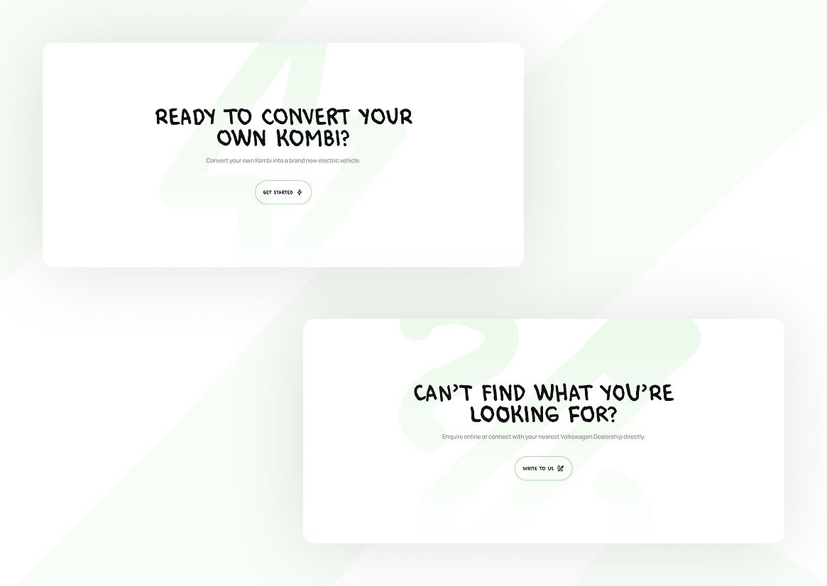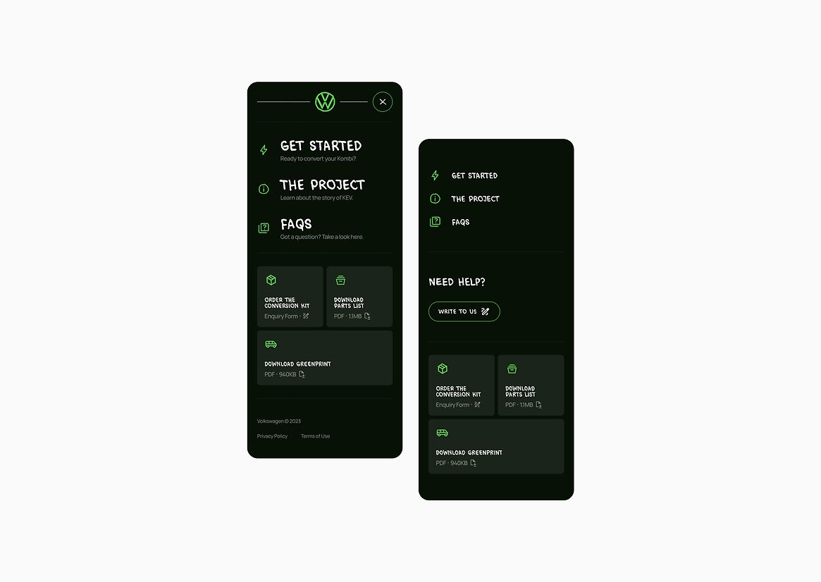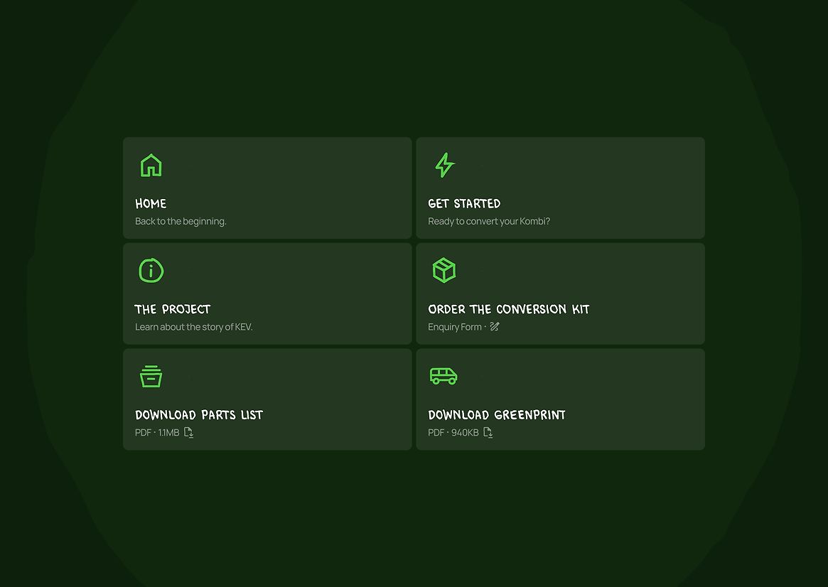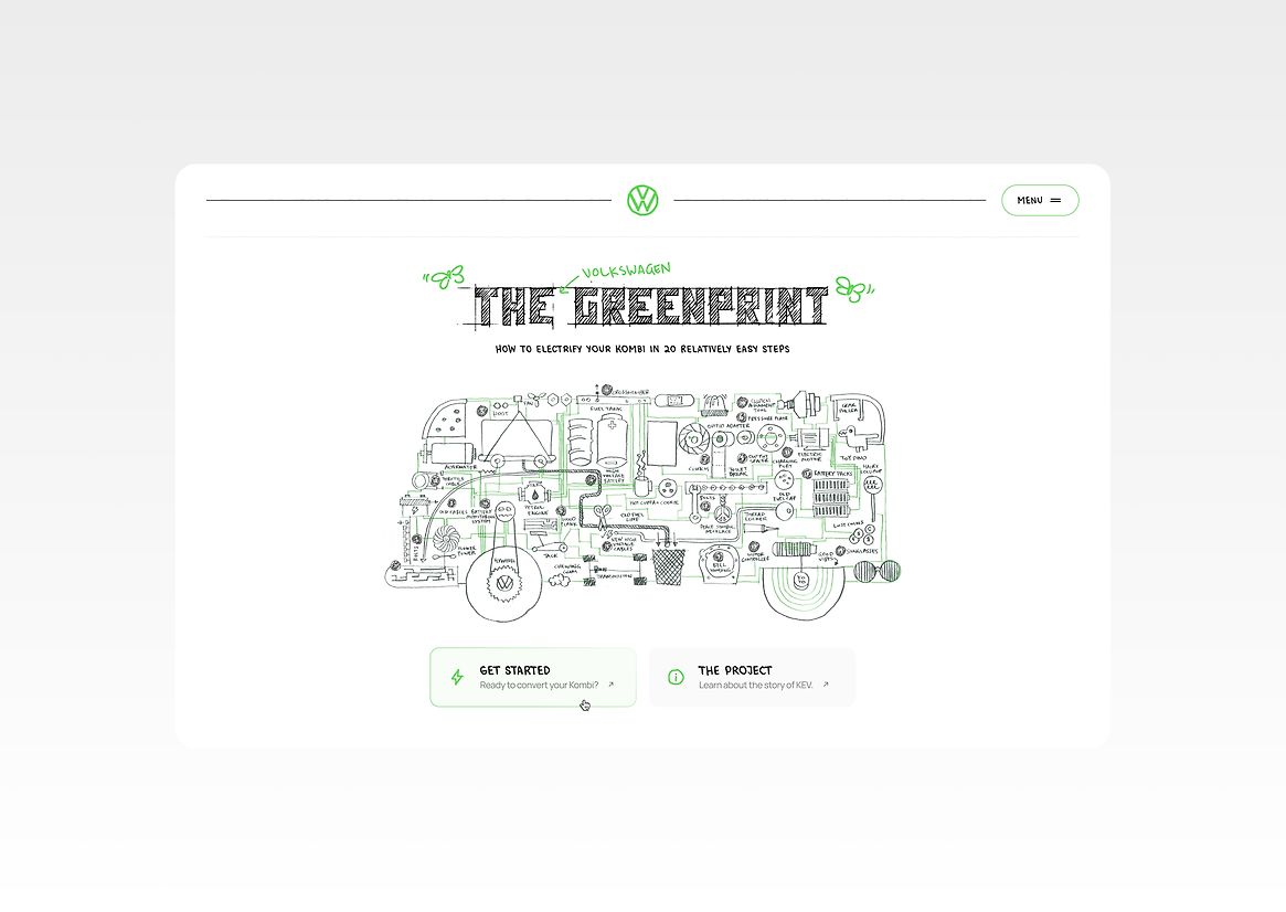 The kombi is an icon for progressiveness, driven by those who believed in a better world. But it’s still a petrol vehicle. So to help those who love their Kombi and the environment, Volkswagen created The Greenprint. An open source set of plans that anyone can use to turn their Kombi into an EV, in 20 easy-ish steps. We made an all-in-one kit available, or owners could source the parts themselves with our approved list, and not pay us a cent. An online hub housed further details about each step, along with user generated videos and FAQs – by the people, for the people in true VW spirit.